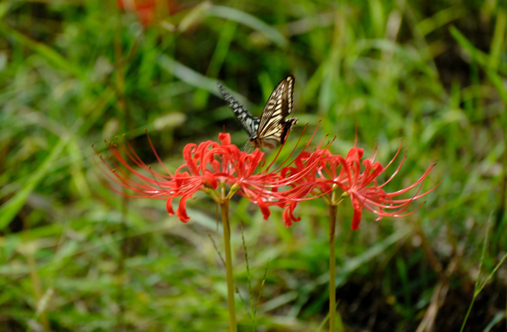 彼岸花といえば、アゲハチョウですね。毎年、かなり見かけます。ただし、今年は彼岸花にたくさんのアゲハチョウが来ているのを目にしていません。あるところでは一頭、また別のところで二頭でした。キアゲハやカラスアゲハなども見かけず、ナミアゲハだけでした。( ;∀;)今年、お初です。彼岸花にアゲハを見たのは。どこに降りようかな。つぼみには止まりません。吸蜜目的ですから。('◇')ゞふわーり。なぜか、赤い彼岸花にしか止まりません。ほかでも白花にはまったくいかないのです。なぜ???翅がいたんでいますね。こういうかっこうだと、少しいたみがめだたないかな。('◇')ゞ