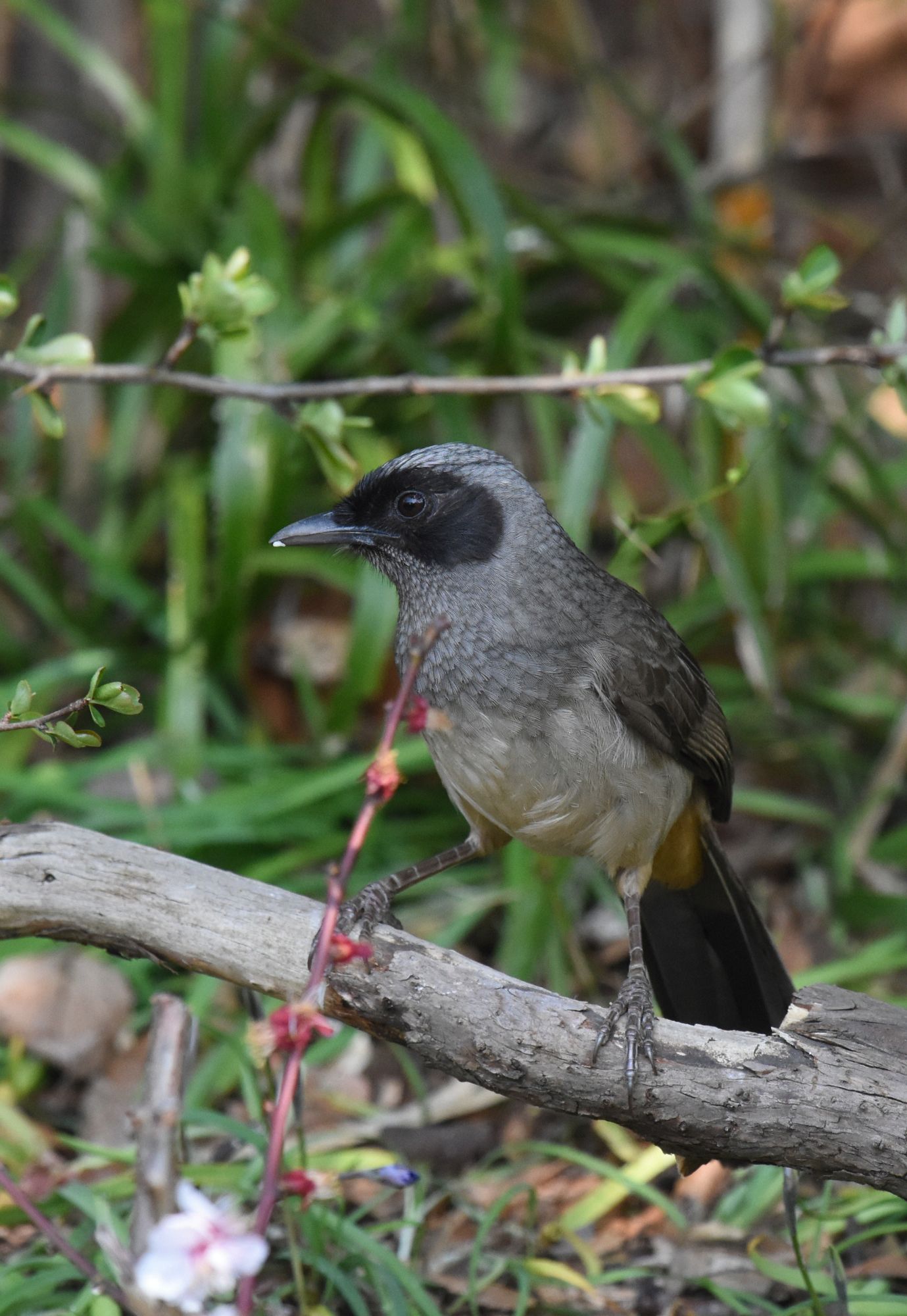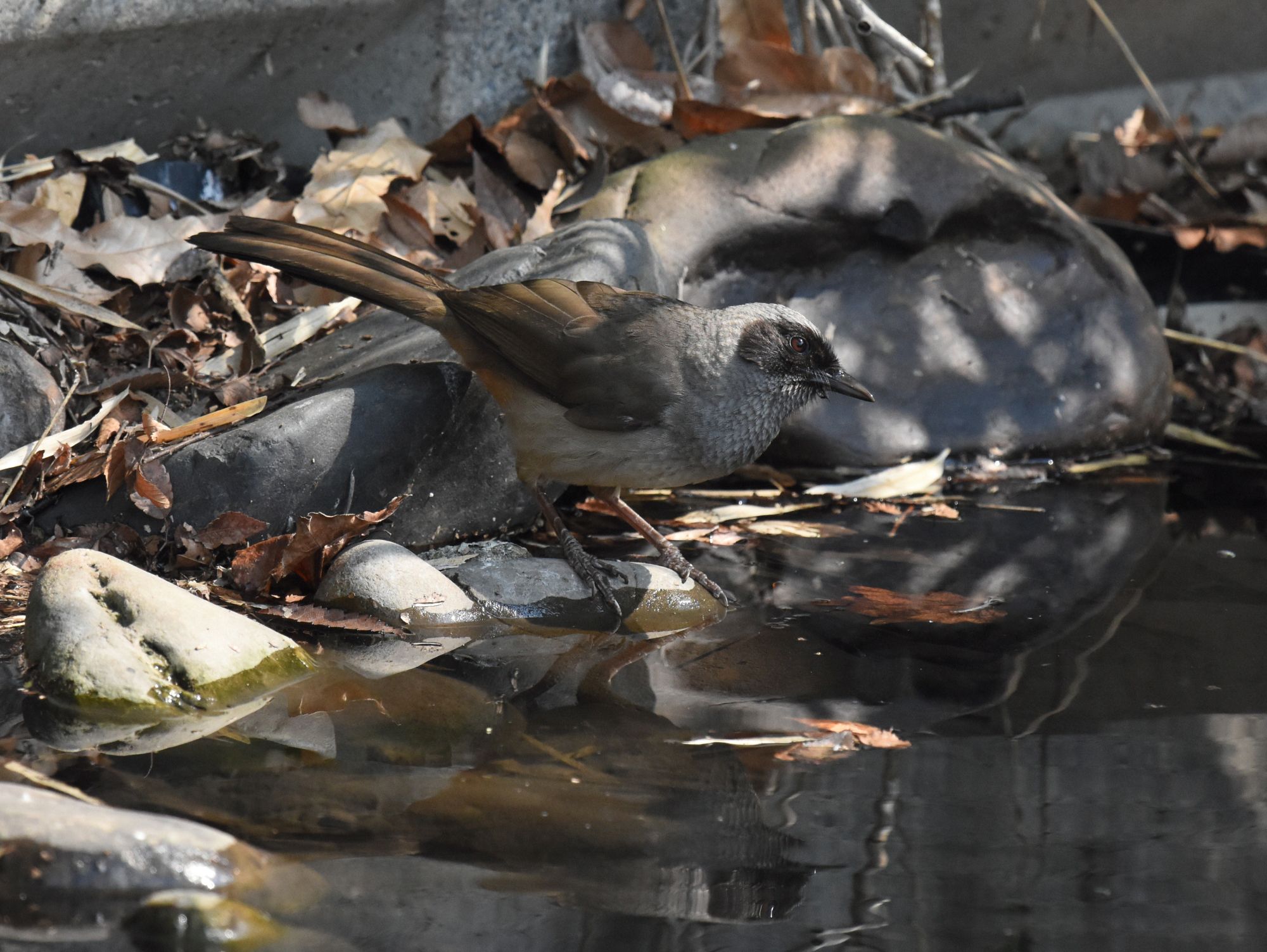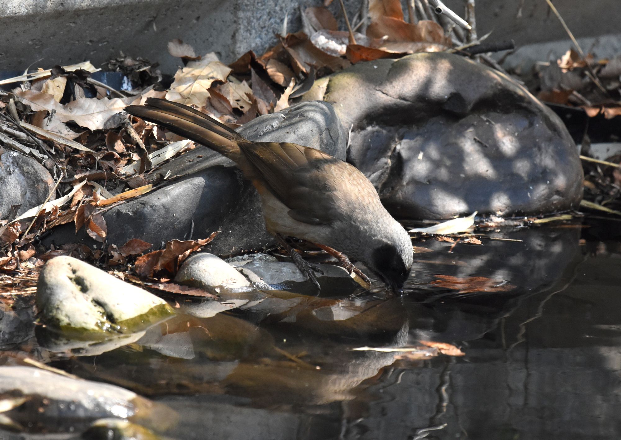 色的にはヒヨドリに似ていますが、顔と尾羽の裏が真っ黒ですね。