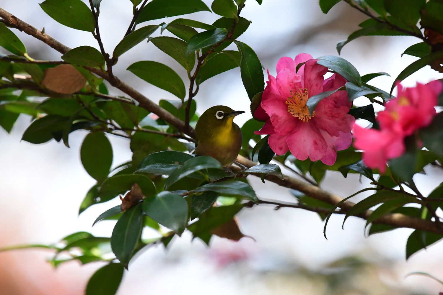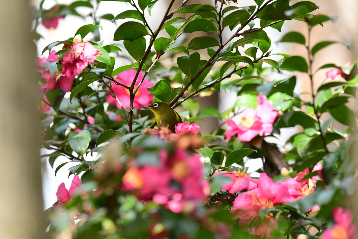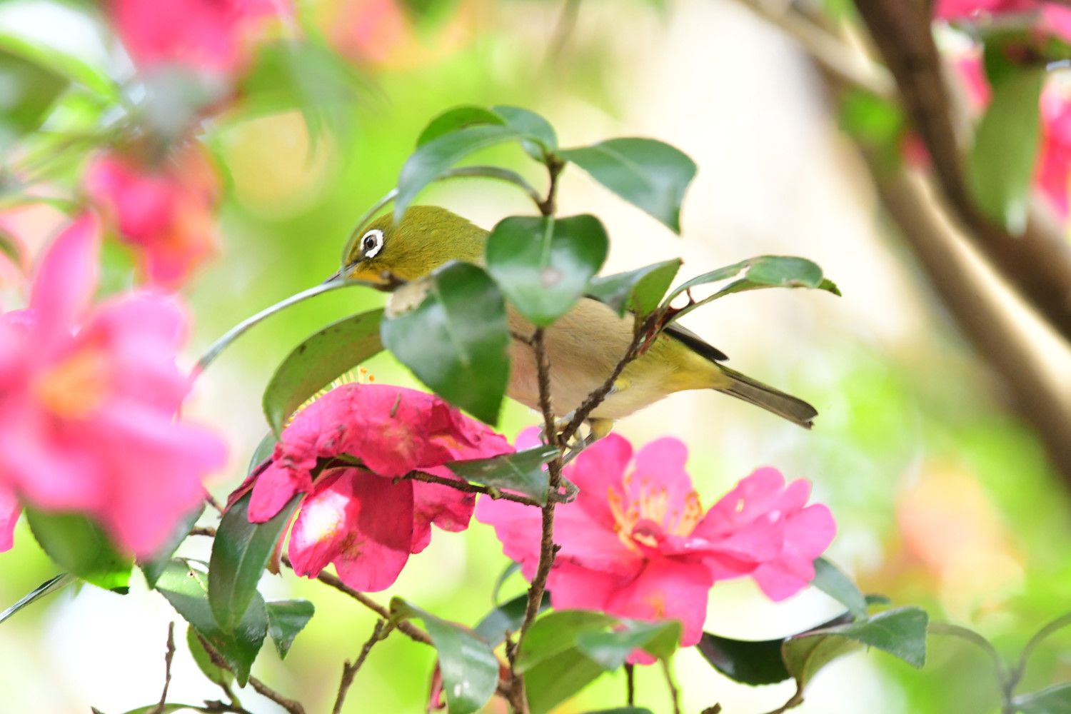メジロのウグイス色と山茶花のピンクがとてもよく似合っていて、お互いをひきたてています。