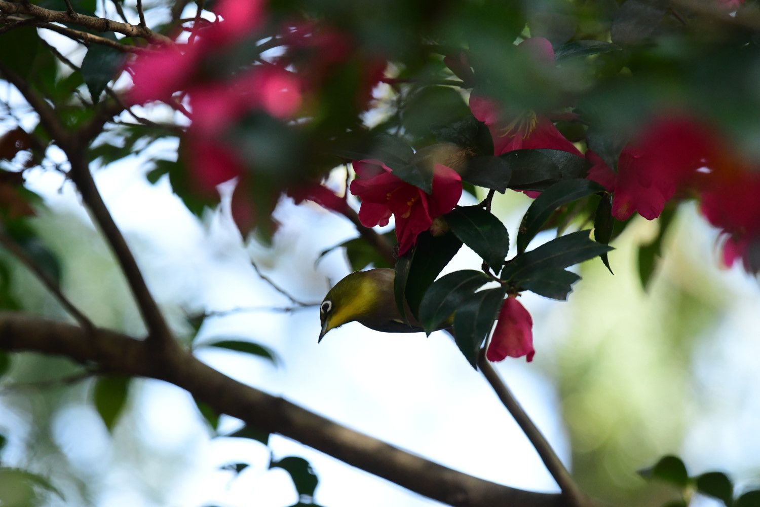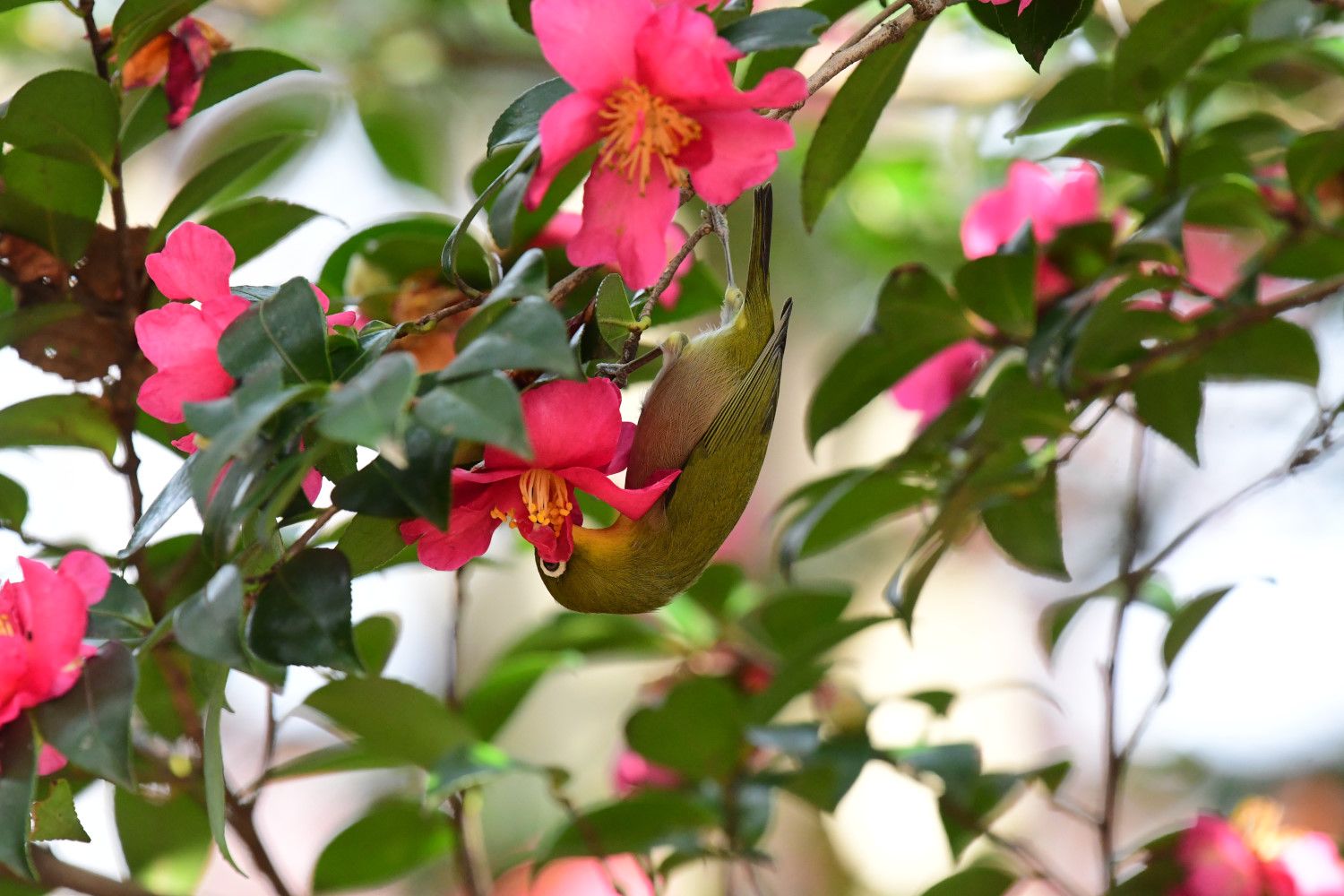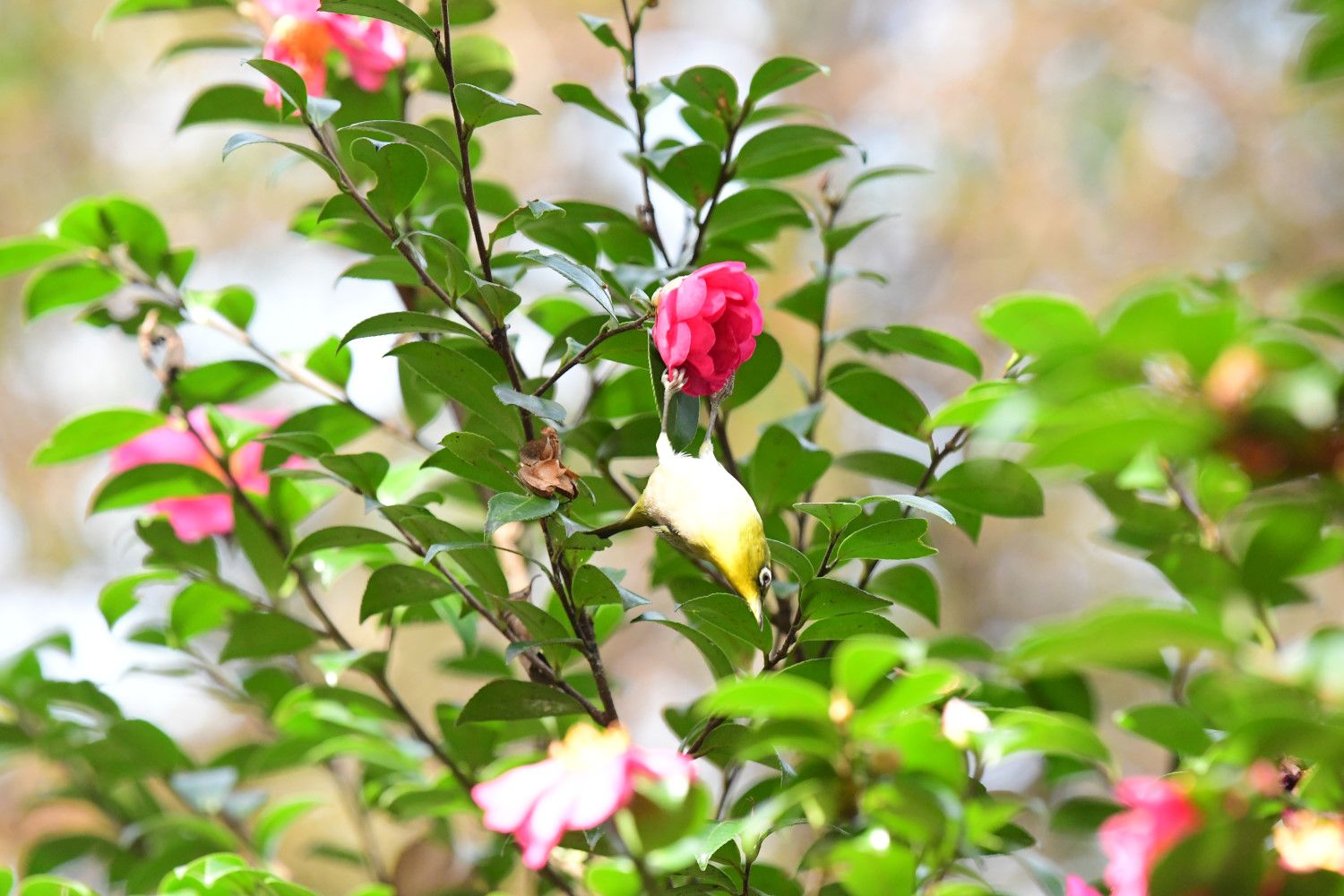 メジロのウグイス色と山茶花のピンクがとてもよく似合っていて、お互いをひきたてています。