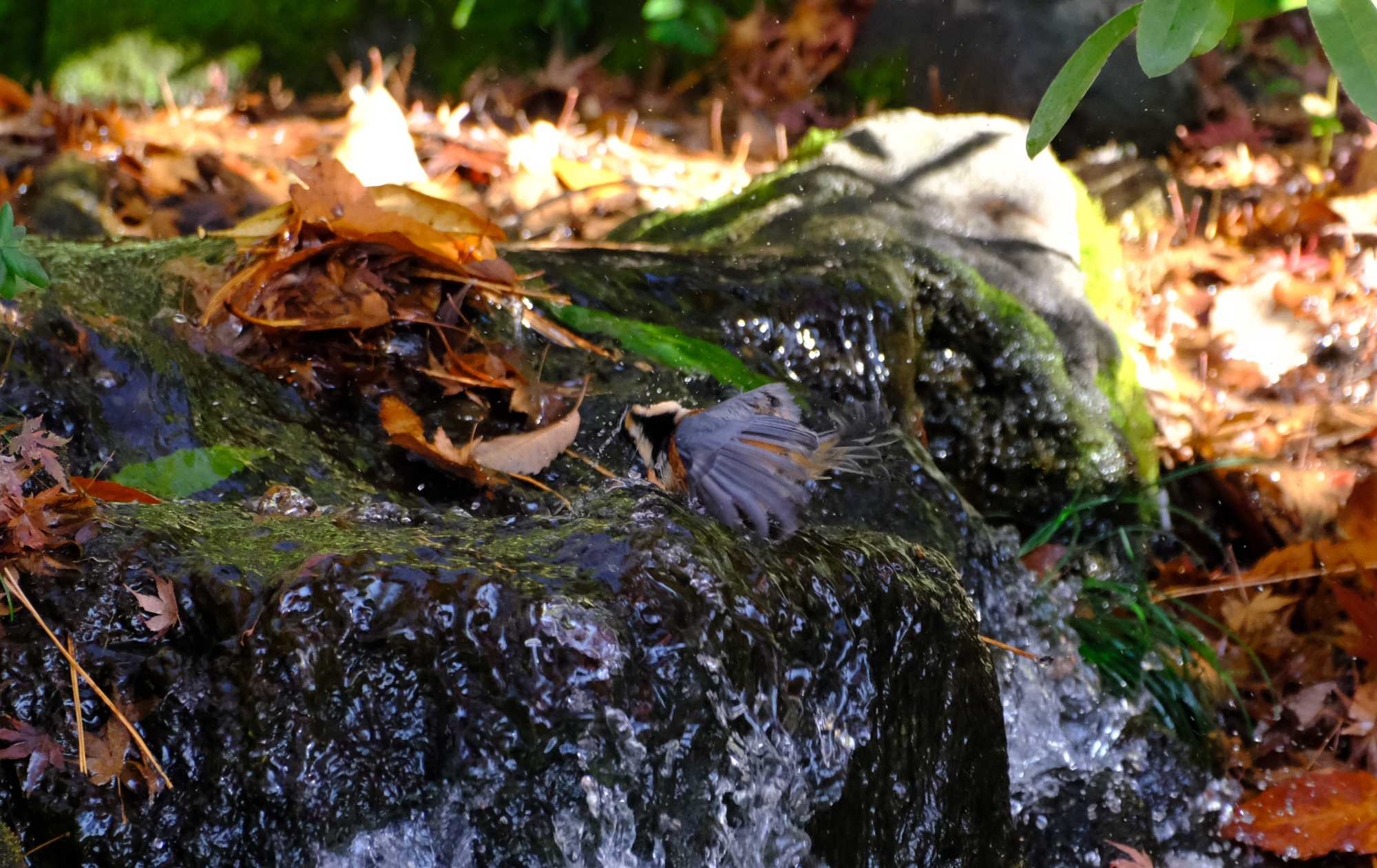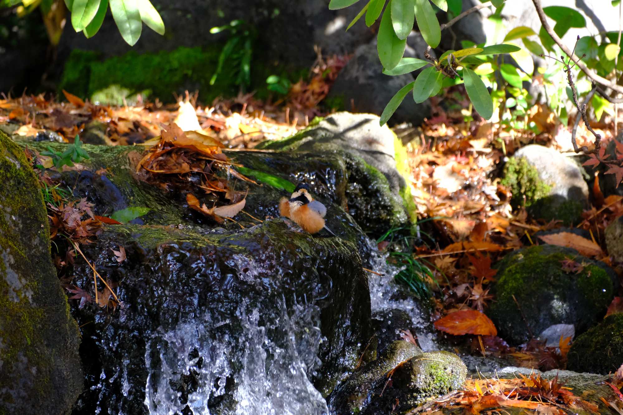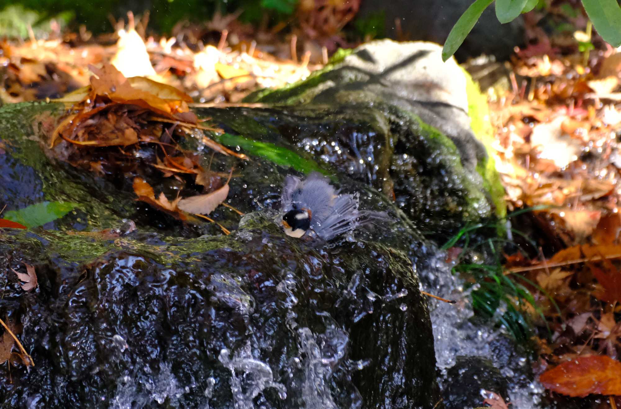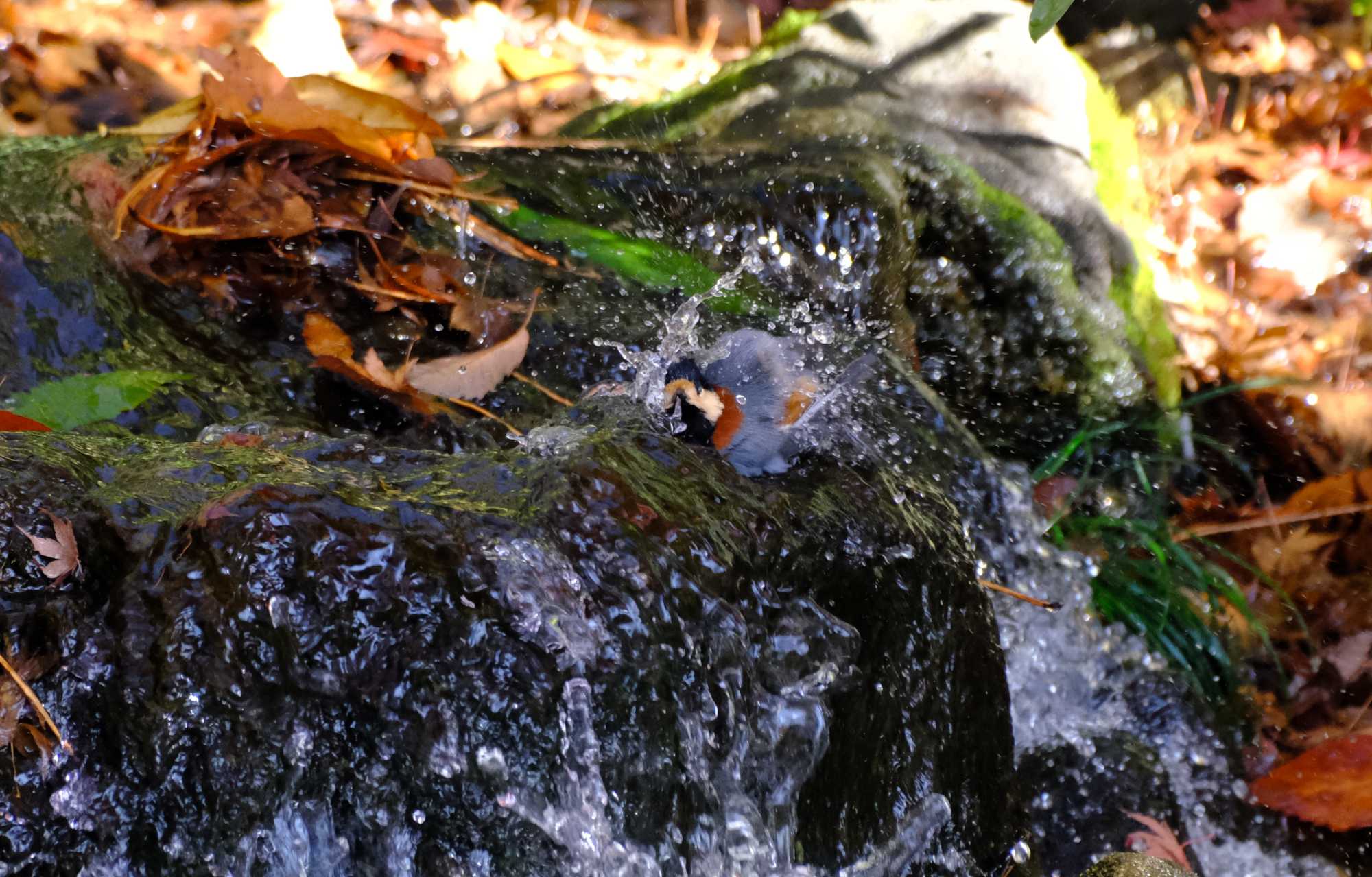 ヤマガラくんは浴びるのをやめてじっとしています。
