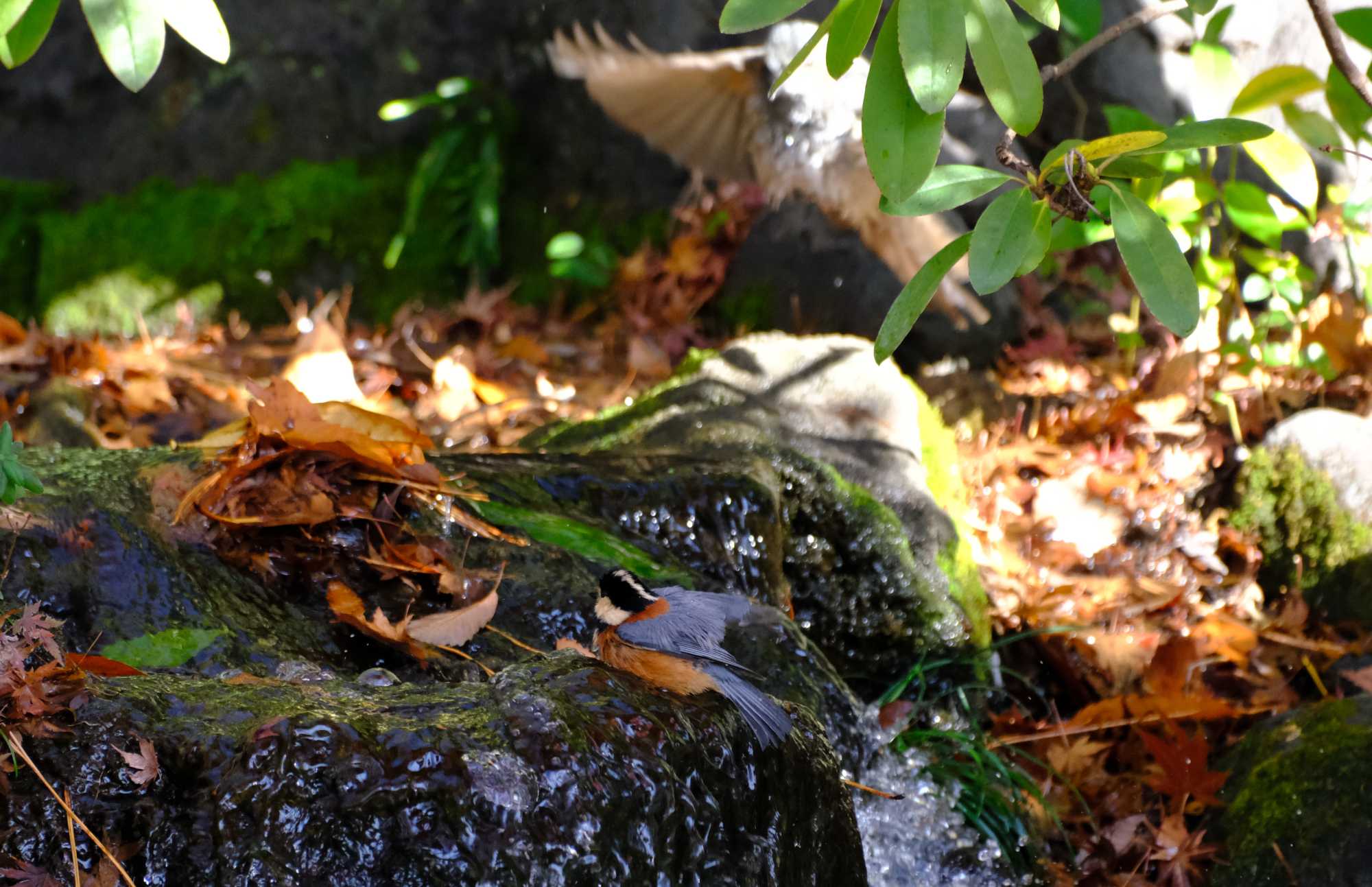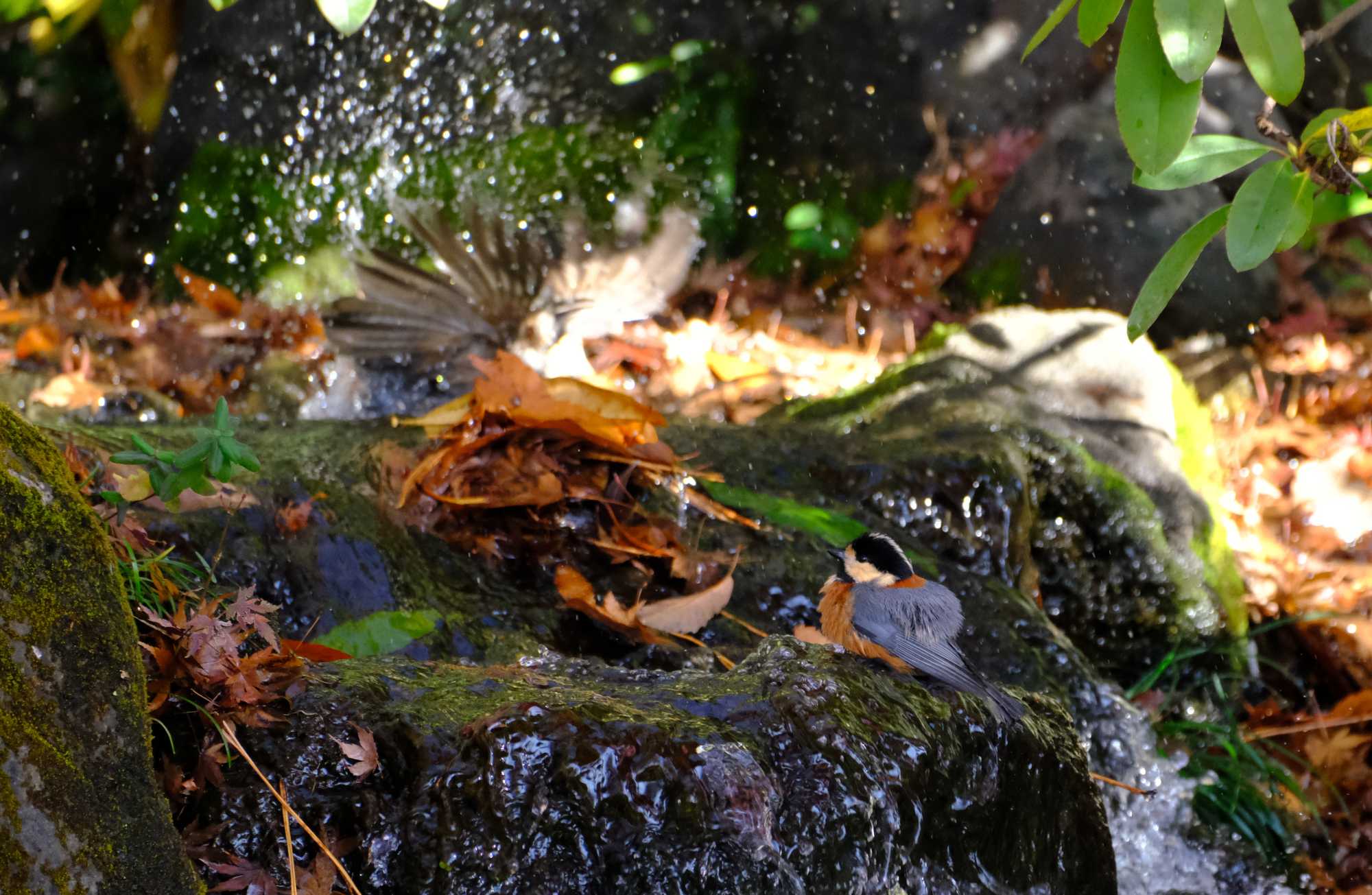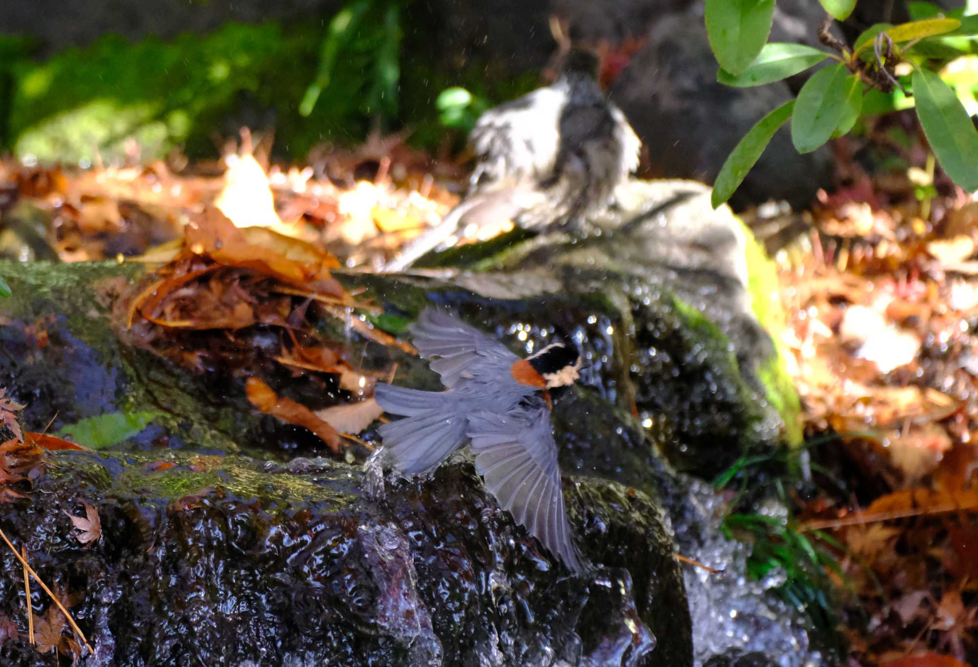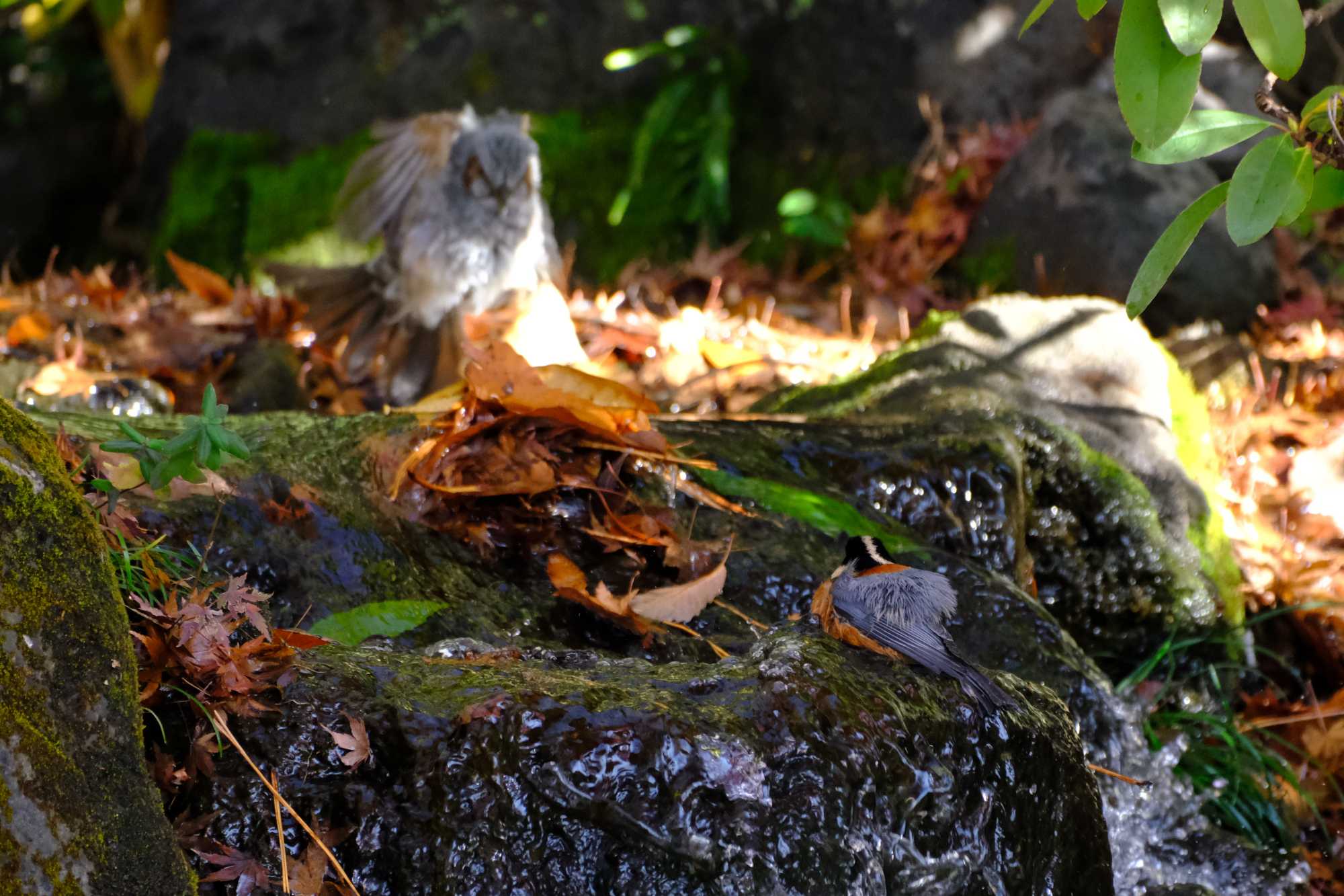 ヤマガラくんが浴びるのを再開したら、ヒヨノスケが戻ってきました。