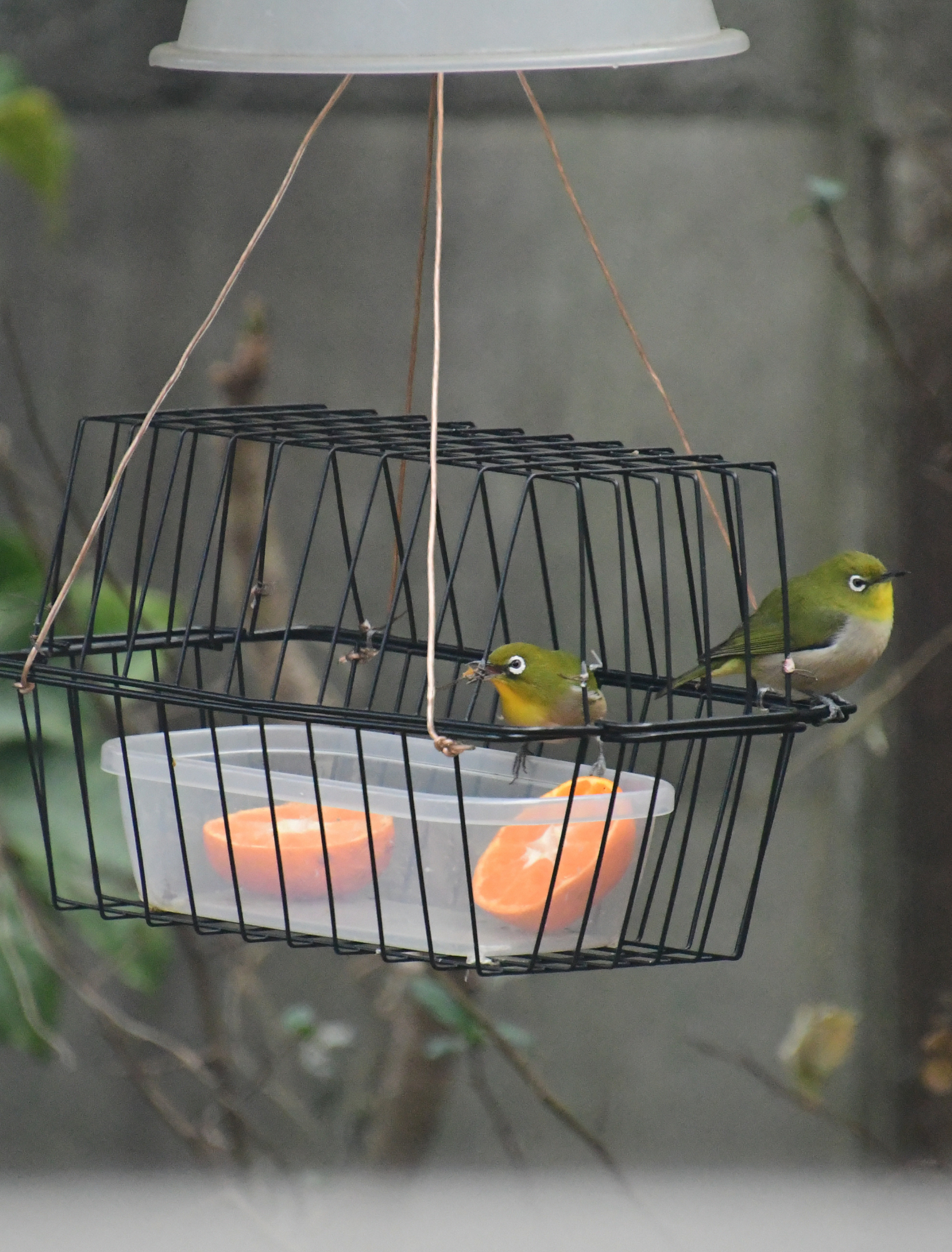 昨シーズンはヒヨドリがこの籠に体当たりしたり、いろいろと試行錯誤をしてミカンを外に持ち出したりしていました。まさに執念を感じました。('◇')ゞ
