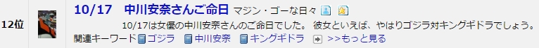 10/17は女優の中川安奈さんのご命日でした。 彼女といえば、やはりゴジラ対キングギドラでしょう。 ゴジラに登場した若き日の安奈さん。 ゴジラで主演した後も、テレビに映画に舞台にと ご活躍されたそうです。 2014年、子宮体がんで亡くなられました。 49歳の若さでした。 中川安奈さんのご冥福を心よりお祈り申し上げます。 合掌 にほんブログ村見たら…押して~♪ゴジラVSキングギドラ <東宝Blu-ray名作セレクション> 楽天アウトドアランキング1位獲得 !!!レビューを書いて送料無料&プレゼント付き!~10/19までポイント2倍!寝袋 シュラフ 丸洗い出来る 耐寒温度-15℃ マミー型寝袋 夏用 冬用 登山 コンパクト アウトドア キャンプ オールシーズン スリーピングバッグ ツーリング オールシーズン 洗える 車中泊 収納 防災用 災害 緊急用 震災 非常用 激安 【送料無料!あす楽対応!】