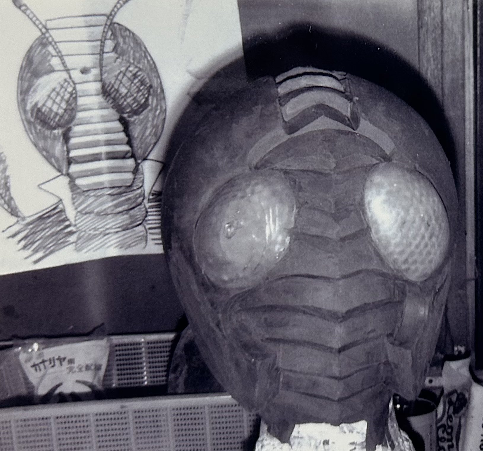 仮面ライダーV3デザイン画を見ながら、粘土でマスクの造形をしているところでしょう。このマスク自体も、まだ完成品とは口元も揉み上げの部分もちょっと違いますね。そして、何より注目して欲しいのは!後ろのデザイン画です。あれは、石森章太郎御大がデザインしたものでしょうね。口元に特別『クラッシャー』のデザインがされていない初期のイラストです。しかし?よく見ると?V3の口元のところに・・・1本ずつ斜めに線の入った部分があるんです。どうやら、石森御大は・・・?あえてクラッシャーを書かなかっただけで、口の部分に斜めの線をちょっと入れると言うデザインを!起こしていたようですね。つまり、V3のデザインには口があったということです。ウーン!これは新しい発見です。ハイ。にほんブログ村見たら…押して~♪Schick(シック) シック Schick ハイドロ5プレミアム 仮面ライダーV3ホルダー(本体+刃5コ)【イス型リュック防災12点セット800E】もらって嬉しい 記念品 自治会 非常持出袋セット