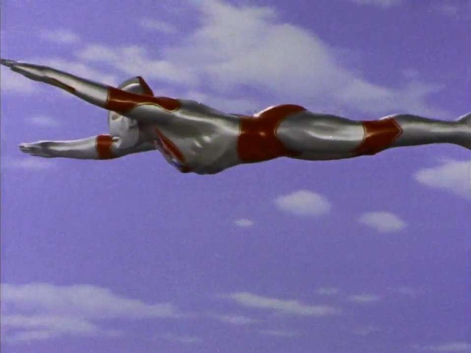ウルトラセブンは両手をハの字に広げて空を飛ぶ。