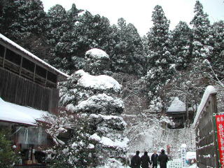 千早園地は思いがけずポカポカ陽気。しばし休憩した後、帰りは念仏坂を下りてゆく。ここの坂は舗装された林道でおまけに勾配がきつい。夏に来たときはヒザが笑ってしょうがなかったが、今日は雪のクッションとアイゼンのおかげで楽勝である。