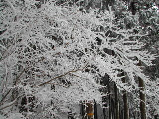 下山中の尾根道の樹氷は幻想的でとてもきれい!でも帰りはえらく長い道のりのようだ。途中、雪の下の金属性の溝の蓋らしき物の穴にアイゼンの爪が引っかかったらしい。気づかず足を進めようとして、思いっきりふくらはぎがつる。