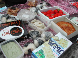山上の広場で満開の桜を愛でながら、最高においしい食べ物の数々を囲み、