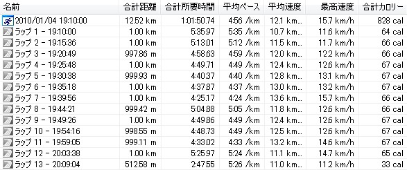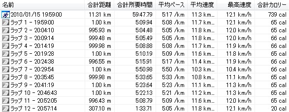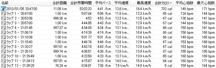 午後はキッチンの大掃除に駆り出され、すぐに熱くなってまうおっさんはどんどん掃除をしてしまい、お陰でキッチンメチャメチャきれいになったで。おばはん感謝せ~よ!!それで時計見たらありゃ~、もう16時半やん。今日は久々にクランチのクラス(腹筋鍛錬クラス)に出ようと思てたので、慌てて用意しておばはんと一緒にジムに行って来ました!なんかめちゃめちゃ久しぶりやねんけど、クランチええ感じです。結構腹筋に来ます。ただ初めて出たときと比べてもだいぶ腹筋周りが強くなったような気がする。一番キツイのをマックスでやりまくって、やっぱりキツいけど、終わってからの疲れ具合が初めてクランチに出たときよりも全然余裕です。これからは自分で腹筋、背筋、スクワットぐらいの補強はやっとかなあかんなぁ~と思てます。それからトレッドミルでランニングです。予定は10km走ですが、昨日と同じパターンで、最初の5kmはゆっくり目のジョグで、足腰が温まった5km以降にペースを上げて走ります。昨日今日と結構走ってるけど、今日もええ感じの走りがでけました。こんなんです↓昨日と何がちゃうかと言うと、ほとんど同じやけど、最後のラップ11のところのペースがキロ4を切るペースになってることです。最後はスパート気味に(でもマックスではなく、ちょっと余裕を残して)走ってみた。全体を通して、特に後半は走ってて凄い気持ちいい。これがリディアードの言う最高安定状態なんかも知れんね。今日の午前中のランニングの時も後半5kmはすごい気持ちよかった。こういう最高安定状態での走りをなるべく多くやっておくことが強い走りがでけるようになるための第一歩やと思います。今年最後のジムもええ感じで締めくくれました!来年も頑張るぞぉ~~~~っ!!!本日のラン10.020 km 41分45秒 14.4 km/h (04'10 /km) 鶴見川、10km走0.290 km 01分08秒 15.4 km/h (03'54 /km) 自宅前、WS1.20 km 05分30秒 13.1 km/h (04'35 /km) 鶴見川練習場までの往復ジョグ11.80 km 56分03秒 12.6 km/h (04'45 /km)ジム、トレッドミル本日の走行距離:23.31km今月の走行距離:325.791km (109%/300km)本日のうんどう:クランチサーキット30分ほな、 クリックしてもらえまっか?↓にほんブログ村