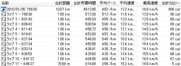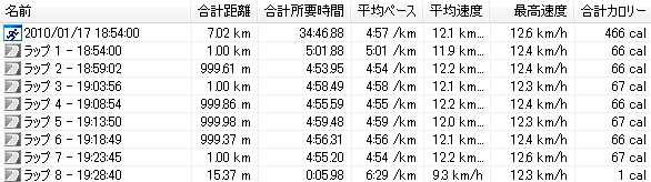 今朝は久しぶりに朝ランしました!でも走り始めはすごい遅めの8時前!メニューは10km走とウインドスプリント。とにかくウエイトコントロールせな、まともな走りはでけへんで!ということで、今日は夕ランか夜ランもしようと思てます。今日の走りは10km走やけど、やっぱり徐々にビルドアップしていく感じで走りました。気温は低めで5℃ぐらい?結構寒いので、耳当て(頭からスポッとかぶるタイプのヘッドギヤみたいなの)をして、下はロングタイツ、上はウインドブレーカーで防寒しっかりして、シューズはゲルカヤノ16君で走って来ました↓ラップ6のところで遅くなってるのはトイレ休憩です。それ以外はええ感じでビルドアップできた。最後の1kmはゲルカヤノ16君やけど、頑張って追い込んでみた。足への衝撃が少ないのでバンバン走れる(スピードでにくいけど)。こうして最後に心肺と脚を追い込んでおくだけでもだいぶ違うと思う。で、さらにウインドスプリントもやってみた↓最初の2本走ってからタイム計ってないことに気付いて計測開始したので、上のは70mを2本走った分やけど、これを2セット、合計で70mを4本走ってます。平均ペースはつなぎのジョグもあるので遅いけど、最高速度は簡単に時速20km以上出てるので、ウインドスプリントをしたら簡単にいい感じまで追い込める割に、距離が短いのでそれ程しんどいと思わないところがいい。やっぱりゆっくり走った後にはウインドスプリントええと思います。オススメです。ほな、 クリックしてもらえまっか?↓にほんブログ村