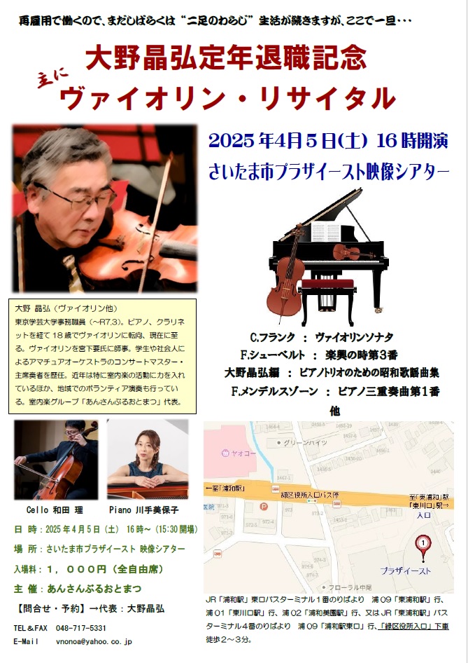 まだブログトップの更新が追いついていませんが、コンサートの告知です。昭和61年に、当時はまだ国のいわゆる出先機関だった国立大学に就職し、その後平成の行革で法人化されて、身分も公務員ではなくなりましたが、2度の計6年間の出向も含めて、この3月で39年間を勤め上げ、定年退職を迎えることとなりました。しばらくは「再雇用」で同じ職場で仕事を続ける予定ではありますが、定年退職という節目を記念してのリサイタルを開催させていただきます。仕事との両立は日々気力・体力の限界との戦いですが、良い演奏をお届けできるよう鋭意練習に励んでおります。皆様のご来場をお待ちしております。あんさんぶるおとまつ主催大野晶弘定年退職記念 主にヴァイオリンリサイタル日時:2025年4月5日(土) 16:00~(15:30開場)場所:さいたま市プラザイースト 映像シアター (さいたま市緑区中尾1440-8)プログラム(予定):C.フランク:ヴァイオリンソナタF.シューベルト: 楽興の時 第3番大野晶弘編:ピアノトリオのための昭和歌謡曲集 (筒美京平:「九月の雨」他)F.メンデルスゾーン:ピアノ三重奏曲第1番出演:ヴァイオリン他 大野晶弘 チェロ 和田理 ピアノ 川手美保子入場料:1,000円(全自由席)