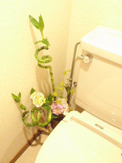 もうすぐ七夕ですね。七夕といえば七夕かざりで使う笹。でも、この笹、水揚げが悪くて(すぐチリチリになってしまうのです。。)いけばなに使うのはかなりのチャレンジャー代わって人気なのが笹っぽい雰囲気たっぷりのミリオンバンブーこの時期、町のお花屋さんにたくさんおいてあります。このミリオンバンブーといま最盛期のアジサイを生けてみました。いつものトイレの空気がなんとなくさわやかになったような。小さい子どもがいると、なんとなく部屋の真ん中にお花を飾りにくいのですが、こういうところだと万一花瓶を倒されても大丈夫。子どもも興味をもって眺めたり、触ったり。時々、お花がとんでもない方向に変えられてることもあるけれど、お花と身近に触れ合っている子どもの姿を見るとなんともいえない幸せな気持ちになってきます。つぼみだったお花が咲いて、しぼんでいく・・・こういう過程を身近に見せることってとっても意味があると感じてます。*…*…*…*…*…*…*…*…*…*☆☆☆メルマガはじめました。登録はコチラhttp://form1.fc2.com/form/?id=318545 から♪がんばるママをひとやすみ ~ココロをほぐす『花』 レッスン 和心くらぶ いけばな教室第2回体験レッスンは7/14(月)です。