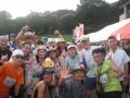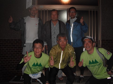 暗~い、4時45分起床。わしらのロングコーススタートは7時なんですが、6時スタートのお見送りもしたいので、早めの起床です。さくさくっと用意を済ませて、5時30分町長さんにもお見送りを頂き、出発~町長さん宅はミドルコーススタート地点なんで、かなり山の上、万場までは500mくらい下るんじゃなかろうか? スーパーロングスタート前はまだ薄暗いです。スーパーロングは50Kでわしらの1時間前スタート。ということは、途中でしかも早い段階で抜かれるんだろうなあ。もしかしたらトップは1時間もしないうちに抜かれる? などといろいろな考えながら、準備。おにぎりの朝食含めて2時間以上の時間があったのだが、用意が遅く、最後は押せ押せ(^_^;でスタート2分前に並ぶがお仲間からはぐれてしまい、後方からスタート。今回はとにかく後半のトレイルを楽しく満喫したいので、みかぼ山までの登りと林道の登りはとにかく歩くことにしてスタートを切る。スタートのロードは6'30/Kくらいの入りかな。メインストリートでは「いってらっしゃ~い」「がんばれー」の大声援を受ける。とにかく登る。登る。心拍いっぱいいっぱいにしない。前腿をパンパンにしないレベルで昇。いつもよりかなり楽なペースかもとか思いながらも、自制しつつ。スタートしてから45分ほどで、「トップ来たぞ~。道空けて~」の声が後ろから響いてくる。スーパーロングペアの栗原さんと小川さんペア。かなりの斜度だったけど、走って行ってしまう。 西みかぼ山の登り途中あたりから、胃がムカムカしだして水しか喉を通らない。まずいなあと思いつつ、さらに歩くペースを遅くする。このあたりからSLの上位選手に抜かれ始める。KFCでご一緒しているまめさんは一桁くらいで通過。トレイルはめちゃ速い人なんだ(年代別2位だったそうな)こんな状態が1時間くらい続いたんだろうか。明らかにおにぎりが消化不良って感じ。でも西みかぼ山頂からは、こんな景色が元気をくれます。 どうにか前半の山場を通り越したけど、まだまだ胃の調子悪し。とうとう椅子に座って大休止。リンゴだけは喉を通ったので、3個ほど頂いちゃいました。なんだかんだと20分以上居ついてしまった。その間、SLのノリさんに抜かれ、まんもさんに追いつかれ。だらだらの林道は平坦、下りはジョグするものの、登りは歩く。今日はあまり時計を見ていない。タイムテーブルなんてのも作る気もなかったんで、とにかく後半に足を温存。本日の最高点白髭山に到着。 そして、そこから こんな感じの気分の良いトレイルとつづら折れのジェットコースタースタート。短めのつづら折れが重なった感じなので、スピードを上げてもすぐ180度折り返しなんで、わしレベルでも快調に走れます。走りながら撮ったら、こんな感じ。 そして、待ちに待った持倉エイドに到着。迎えてくれたのは、こんな少年。雨に濡れて応援してくれてました。「また来てね」と言われたので、「来年も来るよ」と約束。エイドではお蕎麦を頂き、またも大休止。この大休止はちとまずかった。身体が冷えてしまった。噂の縁側エイドでもみかんを頂く、その先で傘も差さずに声援してくれている女性に「ありがとう」と言った瞬間、不覚にも涙がポロリ。なんて暖かい人たちなんだろう。こっちは勝手に走らせてもらっている。でも、神流の皆さんは「来てくれてありがとうね」という。おじい、おばあは「また来て~」という。本当に歓迎されている。暖かさを感じる。 まさに極上トレイルというのは、こういうもの。ずーっと走っていたい、そんな感じのトレイルが続きます。脚が残っていて、よかったなあと実感。ここを走れなかったら、悔い残るよね。このトレイルの最後のあたりで、今回もお世話になったSLの山が好きさんに追いつかれて、ゴールまでご一緒。ロードに出た私設エイドでこれまた、いろいろなものを勧められる。お芋の串、こんにゃく、漬物等々、 そこからは、神流の方々とハイタッチし、握手し、「ありがとうございます」、「来年も来いよ~」とか声を掛け合い、ゴールを目指しました。この区間はおもてなしに対する感謝、さらにそれを上回る神流の人たちのおもてなしの気持ちを受け取る、ハッピーロードでした。そんな暖かい気持ちでゴールまで向かったものだから、鏑木さんがゴールで出迎えてくれていたにも関わらずに気が付かずにゴール(^_^; ゴール後、楽しい仲間たちと 噂通りの感動できる大会でした。来年も必ず参加したい大会ですね。神流の町のみなさん、ありがとうございました_O_ ちなみにGARMINのデータでは15K地点まで、心拍は150から160の間だったので、まだまだ余裕がありました(フルだと165くらいでいけるんで)、ということは登り脚を作れば、次のステージで楽しめるのかな(^_^)vつうことは筋トレかあ~