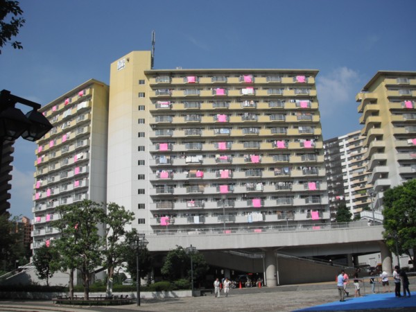 10月2日までの期間で「空の芸術祭」なるものが若葉台で行われている。今後も毎週土日にワークショップがおこなわれるみたい。http://www.sky-wakabadai.com/今日はその一環の「いろほし」というプロジェクト。団地中心部を囲む各棟のベランダから赤く染色したシーツを展示する(干す)。計画では中心部から見える全ベランダに赤いシーツが展示される予定とのこと。最終日は壮観だろうな。 また、これとは別に日比野さんが希望者の各ベランダからの風景画を描いてくれて、それを展示するプロジェクトとかいろいろなプロジェクトが催されている。日比野さんの風景画は気づくのが遅れて申し込めず、大後悔(;_;) 7月下旬に行われた夏祭りでは、空のカーテンなるプロジェクトの成果が展示されてました。 普段はサッカー三昧、ランニング三昧な私ですが、こんな身近な芸術に参加するのも楽しそうだなと思ってます。ちなみに今日は団地中央部分でシーツを赤く染めるワークショップを行って、楽しそうだなあと幼稚園児みたいに5分程度足が止まってしまいました(^_^) http://lockerz.com/s/131481967いろいろ探してみると楽しそうですな。