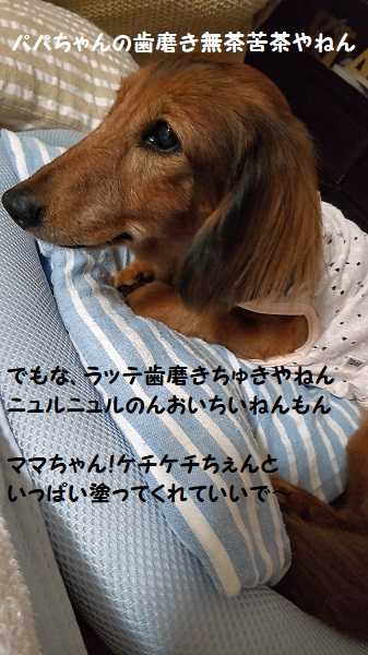 うちの姫君のラテさんは皆さんご存知の通り荒くれ者で自由奔放です (( ̄▽ ̄;;)ア、ハハハハ… こんなんでも12歳までは檻の中で生活していた苦労犬なんですけどね(笑) 檻って言っても、ラテ御殿ですのよ! リビングで門扉にお庭付ですからね(爆) そんなラテお嬢は自らの力で自由を勝ち得て現在に至り・・ 尚、自由権力更新中ですΣ\( ̄д ̄;)ォィォィ もうね、な~んの我慢も遠慮も有ったもんじゃ無い ┐( ̄▽ ̄;)┌ 嫌なことは、嫌! やって欲しい事は、意地でもさせる!ゲットする! アタクシはラテ様よーー♔.゚ そう、品の無い我が儘なお嬢さまです(¬ω¬) 「また自由を勝ち得たなぁラテ!」とはパパちゃん・・ そのパパちゃんが呟いた(¬ω¬) 「なんでも催促してくるのに、水だけは欲しくてもせ~へんな!」って^^; ほんまや~!確かに確かに、糞我が儘なラテちんが唯一見逃してくれる事だわ(( ̄▽ ̄;;)ア、ハハハハ… ご飯中はお水を避けてるんです、20分程・・ たまに忘れる・・ 出す事を・・ ラテは食後お水を欲するみたいで、お水飲み場に行くの。 食後に飲みに行っても無いのはしょうが無い、わざとだからね! ただ出し忘れてるから、何回行っても空振りなんやけど・・(^▽^;) でも、クレクレ!とは絶対に言いに来ない!ど~でもいいのかなぜか催促されない これが、水以外の事なら、私をイライラさせる程に催促三昧で煩いのに・・(# ゚Д゚) 水は欲してても別にいいみたいで見てておもしろい (¬ω¬) なんで? 何回も何回も水飲み場でウロウロして、私を見るを繰り返してるのが可愛くてね(笑) ゴメンゴメン!早く飲ませないと歯垢が付いたままになるからね! なので、歯磨きをされるラテちんなんです( ̄ー ̄) で、パパちゃんがお仕事に出ると・・・ この悪態↓ あ、すみません ただいま・・(。_。 (゚ㅂ゚ )(。_。(゚ㅂ゚ ) かしこまりました・・(。_。 (゚ㅂ゚ )(。_。(゚ㅂ゚ ) って、なんでやねんΣ\( ̄д ̄;)ォィォィ 遊びに来てくれてありがとうございます<(_ _)> ↓ポチっと応援していただけると嬉しいです。 更新の励みになります^^ にほんブログ村 にほんブログ村 ミニチュア・ダックスフンドランキング