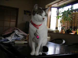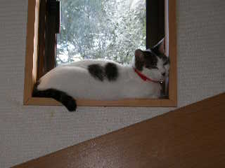 たまちゃんの お気に入りの場所よぉ~~階段の光り取りの窓!!カーテンの中!!PCディスクの上!!ここは リンからの避難場所かな?コートの中!!リンに 見つからないでぐっすり寝れるニャァ~玄関の三角出窓!!階段のかげ!!(たまちゃんは 見ている??)炊飯器の上!!寒い時は ここが一番だニャァ~~ (ふたを開けるボタンにビニールテープをギザギザに貼って たまちゃんが 乗らない様にしているのに この間 乗ったみたいで ふたが開いて 炊いてしまって3合のお米がパーよぉ~)毛糸の中!!紙袋の中!!あ!! みつかったニャァ~~!!