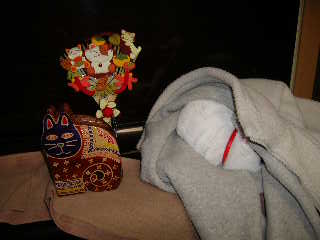 太宰府天満宮に お参りに行って来ました太宰府天満宮は 学業の神様で福岡の 観光名所になっています結構 お参りの人が多くて びっくりです参道には たくさんのお店が並びますエスニックのお店で羊の皮で出来た 猫の貯金箱ちりめんのお店で猫が付いた くまでを買いましたなかなか かわいいでしょう??天満宮の横から 九州国立博物館に行けますびっくりするほどの 長いエスカレーターです遅い お参りと参道をブラブラ遊んで来ました帰る車からは 綺麗な夕日が・・・・・今年も よい年になるかな??今日の おまけ!!やっと 座れるニャア~~!!鏡餅を かたずけたらさっそく たまちゃんが座ってますよぉ~~それも お餅の台の上に・・・・
