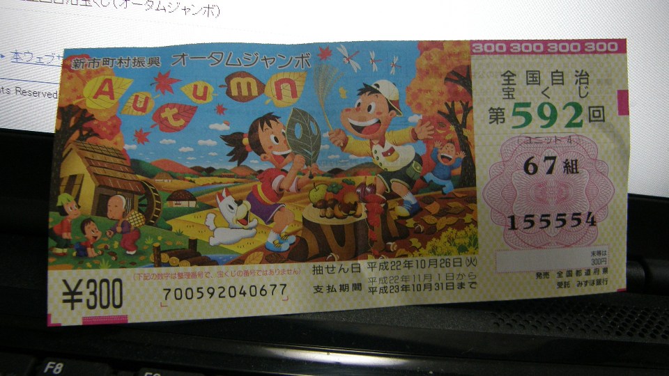 19:19 晴れ昨夜はかなり雨量があったようです。今日は9時から湖西中学校の文化発表会があり自治会代表として参加しました。内容は合唱、和太鼓、吹奏楽などの発表と美術品の展示などでした。午後2時からは自治会トップセミナーと言うものに参加しました。内容は「地域防災における女性の役割について」と言うテーマの講義でした。-------------------------オータムジャンボ宝くじ券・・・(5枚買いましたが全部外れでした)