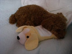 連休中にわたも連れて小旅行に行くつもりだったので、少し間隔が短かったんですが、トリミングしてもらいました。結局連休に引越しする事になり、旅行は中止になりましたが。(ちなみに、引越しといっても、同ビルの2階から6階に引っ越すだけです。今まで住居は6階で、母の事務所兼荷物置き場が2階だったのですが、6階のお隣が空いたので、2階を売って6階を買うことになりましたちっちゃいビルで、6階はうちだけになったので、廊下に人工芝を引いて、ミニミニドッグランを作ろうと計画中です~)今回のトリミングは、大満足可愛くしてもらえました~(▽)お顔は小顔テディで、体は短め。そしてわたあねのこだわりポイント「尻尾はボンボンに」とお願いしました。お疲れわた君は、私のベッドから降りないので、背景がちょっと悪いですが~ 尻尾はまだ長さが足りなかったので、中途半端なボンボンに。後一息かなせっかくなので、andyちゃんに挑戦して(笑)、おリボン付けてみましたハロッズに置いてありそうな縫いぐるみっぽい~赤いリボンもと思ったら・・・もう限界このまま眠っちゃいました~