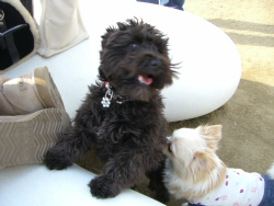 11月5日の、ドッグサロンベルジェさんのイベント、トイプードルDAYに、参加してきました。りんりんさんとダンナ様とリュウ君にも付き合ってもらいました私がお誘いしたくせに、待ち合わせに大遅刻~ごめんなさい先にランに向かってもらい、あわてて追いかけましたが、駅から結構遠いし、道に迷ったりして・・・あせりました~なんとか到着。やっと会えました。リュウ君。久しぶり~可愛くて、元気いっぱいです動きが激しすぎて、写真が撮れない~可愛いリュウ君を撮ろうとしていた他の方も、苦労してました(笑) わたはマイペース 私はたくさんのトイプーちゃんを見るのが初めてで、テンション皆可愛い~飼い主さん達も優しくて気さくで、感じのいい人ばかり~。そんな中、とっても嬉しいハプニングが「個人的にはこの子が一番好みだわ~」と、わたに、めちゃめちゃ嬉しい事を言ってくれた人がいましたデレデレしながら近寄っていき、名前を聞かれ名乗ったら、「え?わたちゃん?!ブログしてます?」ってなんと、シフォン君とマフィン君のママのうにさんでしたシフォン君とわたは遠い親戚。お顔もなんとなく似てる気がして、いつか会いたいな~と思っていたんですお互い全く気付きませんでした~。しばらく一緒に遊んでたのに~シフォン君&わた。やっぱりお顔が似てるよねシフォン君は、ブログでみるより色が濃いような。そしてブログよりお上品な感じ?(笑)気品が漂ってましたよ~マフィン君&わた。マフィン君、ずっとさわっていたい位、毛が柔らかくてフワフワ~お目目クリクリ。パピーちゃんだわ~可愛いわ~うにさんは姪御さん2人も連れていて、姪御さん達も可愛いかったです~シフォン君は、うにさんに「社交性がなくて~」と言われてましたが、実は社交的ランの風景を適当に撮ってた写真に、しっかりうつってましたよ~わたのおケツにお顔を突っ込んでるシフォン君がイベントは、フォトグラファーのいとうしんやさんによる撮影と、ゲーム大会があって、ビンゴゲームでは、りんりんさんはブランケットをゲットしてました私は残念賞で、ウン処理袋100枚をゲット。それも結構嬉しかったです撮影の時は、1ワンずつ別室に呼ばれ、撮ってもらうのですが、私は気合を入れ過ぎて、お着替えを3枚も持って行っちゃいましたちゃっかり全部着せちゃいましたわたは、台の上+洋服=固まる なので、ポーズを付けられると、そのままで微動だにせず、撮影は超順調~「厳しくしつけてるんですか?」「何枚でも撮れますね~」と、お褒めの言葉を頂きました。固まってるだけなのに・・私は、親バカを通り越して、わたのファンになりさがり・・・「キャー(≧▽≦)可愛い可愛い」を連発撮影が終わって我に返り「すみません」と言ったら、「いえ~ホントに可愛いですもん」と言ってくれました。優しい~さすが動物のフォトグラファーさんその後ランを出て、りんりんさん達と、シャレー・スイス・ミニというカフェに移動~このカフェは住宅街にあって、スイスの国旗がなかったら、絶対わからない場所でした~なんていうか、すごーく「別世界」を味わえるカフェです~(笑)オススメですテラス席はウッドデッキになってて、ワンコです。私はバゲットセットを頼みました。美味しかったです(いつものように、食べ物画像は撮ってません) ここに来て、落ち着いたみたい。やっと撮れたリュウ君私は、りんりんさんとすっかり話しこんでしまいました。楽しくって、話題が尽きることがないんですよね~わたとリュウ君はおりこうさんに、お膝でネムネム。わたは時々困ったちゃんな事もしてくれましたがリュウ君の熟睡姿も見れて、可愛かった~りんりんさん&ダンナ様&リュウ君、お付き合い、ありがとうですお土産もこんなにいっぱい頂いてしまいました~すっごく楽しい日でした