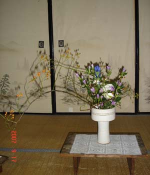 9月より、いけばなを習い始めました。先週の第一回目のお稽古は、あいかに乗っている時から寝てしまった為、ママだけレッスンを受けました。流派は、「桂古流」桂古流は、江戸時代末期に養真斎白龍によって創始されたそうです。白龍は、桂宮家に華務職として仕えた人で、池坊と未生流の良い所を合わせ、桂古流を創流したそうです。初回は、軽井沢の野草を使って盛り花(直立型)のお稽古をしました。*体は10度傾ける。用は体の半分*剣山は中央を避けるお稽古から、数日後に撮影しましたので、お花に元気がなくなってしまいましたが・・・第一回目の画像を残します。本日は2回目のお稽古傾斜型のレッスンを行いました。*体は、30~60度傾けるママの作品今日のあいかは、いけばな やる気満々な様子エプロンをして、さっさとはさみを使って花を切り、オアシスに挿していました。ママよりも早いスピードで仕上げ、完成黄色いとうがらしも欲しいと、ママの花材を要求するほど・・・百合の位置だけ手直しをしてもらっていましたが、最初にしたら上出来!と褒められていました。あいかの作品ママがメモをとっていると、それをみて自分もメモ用紙とペンが欲しいと言い出し、なにやら書いていました。目標は・・・一年間かけて、奥伝まで目指します。