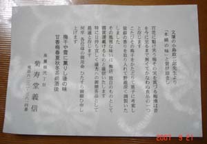9月20日ママは学会の為、大阪へ向かいました。朝寝坊をしてしまったので、朝から慌しく自宅を出発。予定していた新幹線に、ギリギリセーフで乗れました大阪に到着すると、ブログで知り合った方とヒルトンホテルで待ち合わせをして、ハービスENTの「マーレ クッチーナ」でパスタを食べました。昼時だったので、店内は混んでいて、知人が予約をしてくれていたので助かりました。お話しをしながらランチをして、シャトルバスで会場入り。夕方まで講演を聴きました。今回の滞在はひとりで行ったのですが、学会会場で大学院時代の先輩と偶然会い、先輩の同期会に入れてもらう事になり、夜はなんばへ行く事に・・・先輩方とお酒を飲みながら、ゆっくりとお話ができ、実り多い有意義な時間を過ごせました。ホテルに着いたのはAM2:00(学生以来、こんな時間まで飲んだのは初めて)終電が無くなったので、ホテルまで先輩にタクシーで送って頂きました。9月21日学会後、結婚式の時にウェディングドレスを作って頂いたデザイナーさんYさんとお会いしました。学会が大阪で開催される事が決まった時に、会場の近くにアトリエがある事を思い出し、私の方からメールをお送りしたのです。久しぶりに連絡をすると、結婚式からずっと私のブログを読んで下さっているとの事嬉しさ&驚き&感謝&感激の気持ちでいっぱいになりました。また大阪でお会いする事が決まると、色々とプチ観光のご提案をして下さり、Yさん手作りパンフレットを家族で見ながら感動してしまいました。お忙しい中、お時間を割いて頂きましてありがとうございました。楽しみにしていたYさんとの4年ぶりの再会・・・期待していた通り、それ以上かも・・・とっても楽しい時間を過ごす事が出来ました。まずは、Yさんお薦めレストランの「Aのテーブル」で自然派フレンチを頂きました。おしゃべりに夢中で、なかなかお料理が進まず、テーブルの上はスープやサラダ、メインでいっぱいに・・・(笑)もちろんお料理はとっても美味しかったですのんびりと公園を散策してから、新しいアトリエへお邪魔しました。旦那様にもお会いできて良かったです製作途中のウェディングドレスを見ていると、4年前の事が懐かしく思い出されました。楽しい時間はあっという間に過ぎ、そろそろ帰りの新幹線の時間に・・・Yさんご夫婦から、素敵なお土産まで頂きました。 なかなか手に入らないそうで、先週私の誕生日だったという事で、お店に無理を言って、用意して下さったそうです。うちに帰ってから開けてくださいね~との事・・・自宅に帰ると、駅まであいかが迎えに来てくれました。もちろん真っ先に、Yさんから頂いたお土産を渡しました。その模様は画像で・・・家族が見守る中、あいかが自分で包み紙を開けだしました。なんだろう~?? 箱を開けると、中に壺が入っているよ。 梅干? よし!蓋を開けよう。 みて~梅干だよ。 ぱくり あれ?梅干じゃない!!梅干そっくりな和菓子でしたあいかも続けて2個ぺろり家族みんなで美味しく頂きました。Yさん&旦那様 ありがとうございました。1泊2日の大阪滞在でしたが、濃密なスケジュールで思い出深いものとなりました。