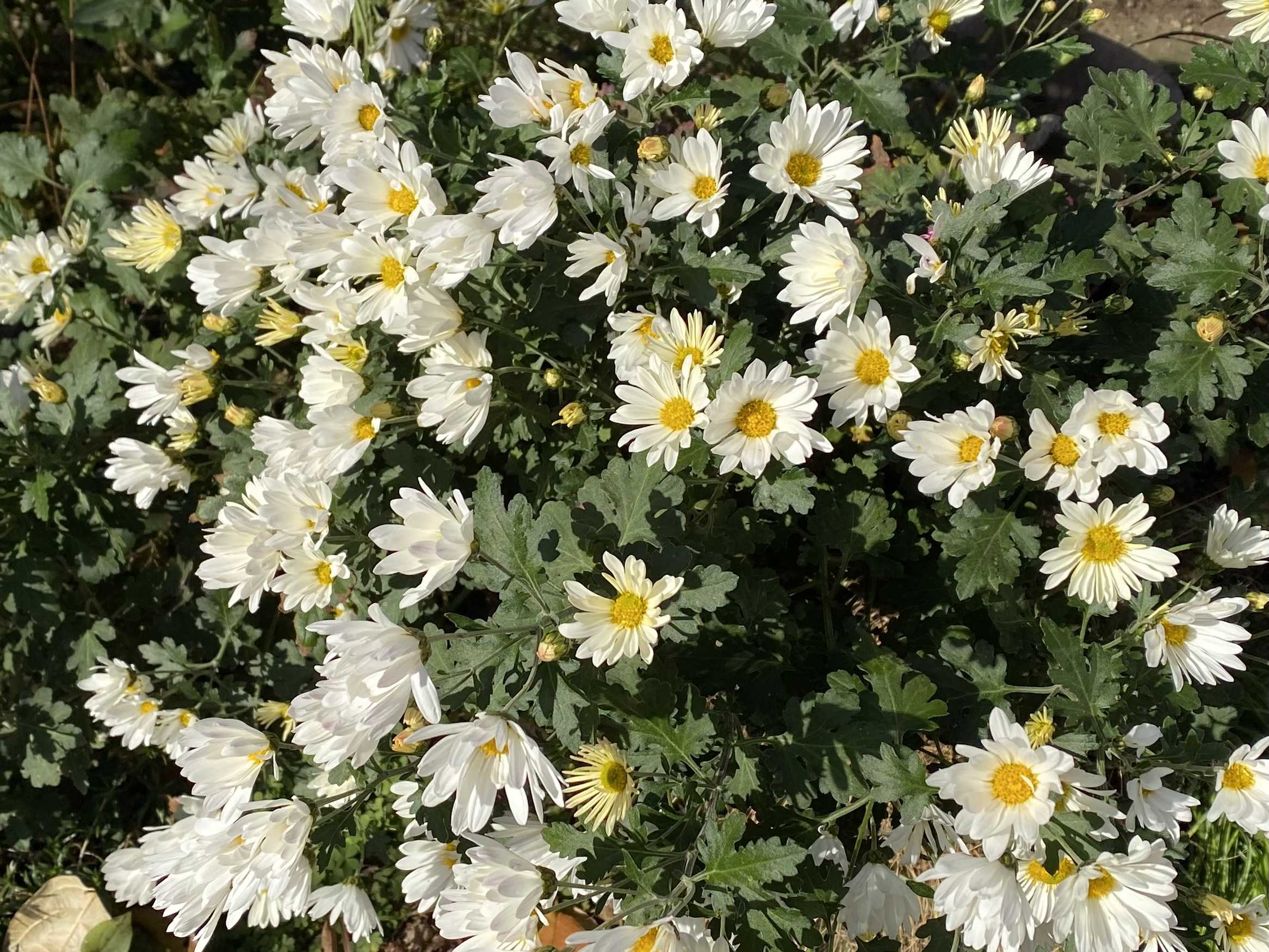 白い小菊が満開です。暖かな朝、陽を浴びて、とっても綺麗です。生協の登録商品に、豆腐…