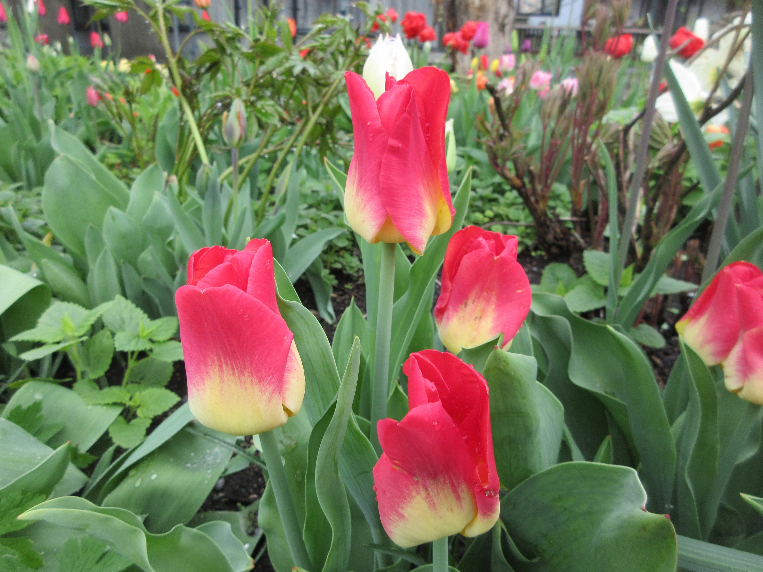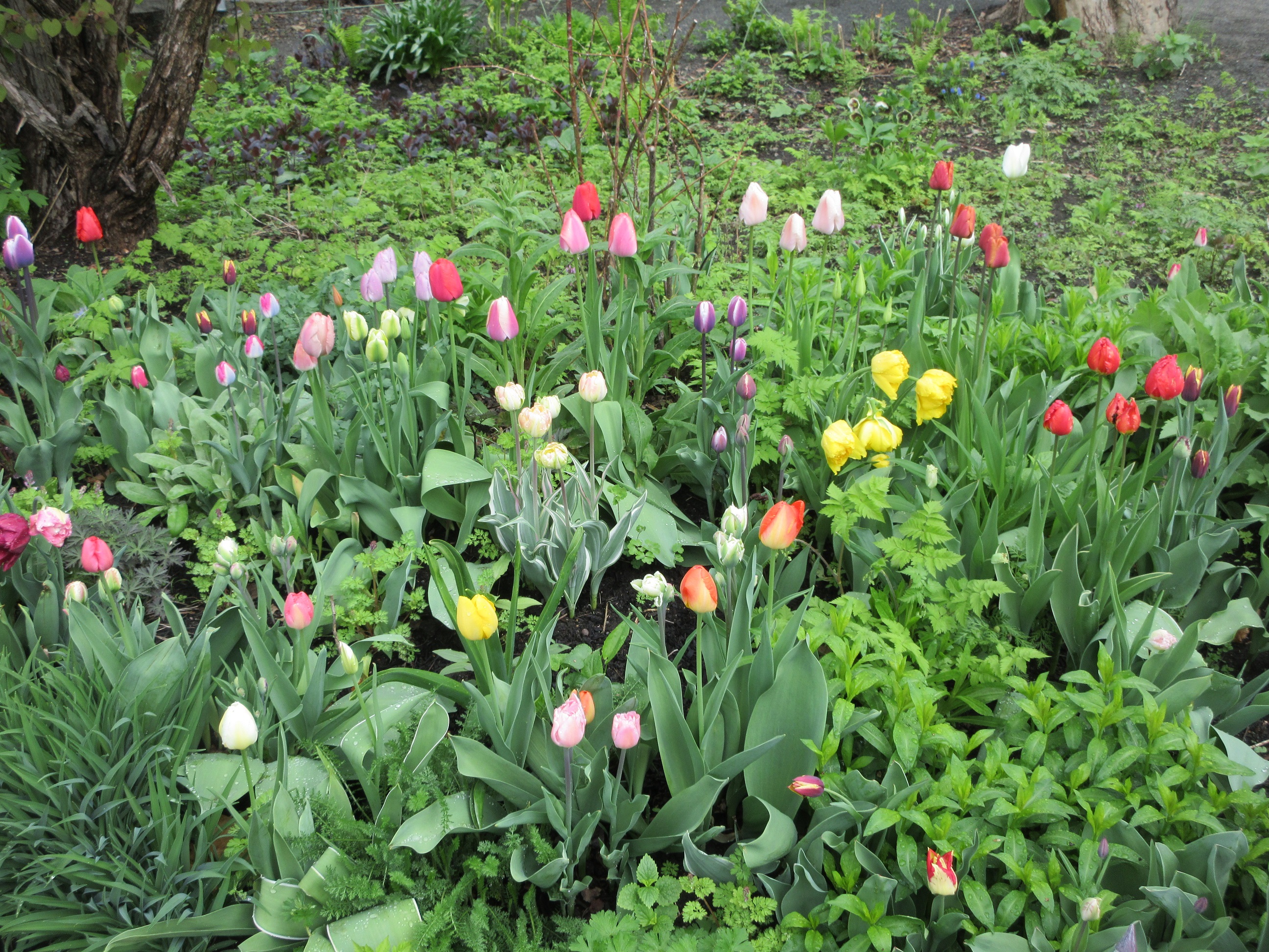 ね? 色とりどりのチューリップが、今にも咲きそうでしょ? きっと今日はもっと咲いてますよ