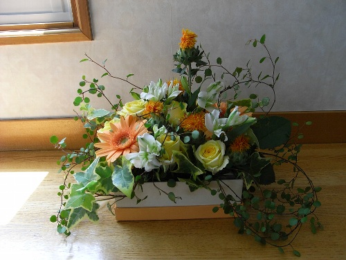 ボックスにアレンジして持ち帰りです。SPバラ、紅花、ガーベラ、アルストロメリア、ワイヤープランツ生徒作品