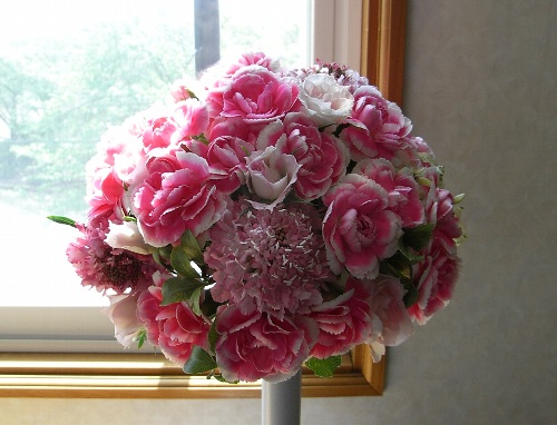 ラウンドブーケ 生徒作品SPカーネ、SPバラ、スカビオーサ
