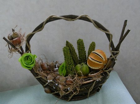 ドライフルーツ、実物をカゴに貼り付けて3人ともそれぞれ違った作品に仕上がりました。ドライフラワー オレンジ、ナッツ、アワ、アップルなどプリザーブドフラワー ローズ生徒作品