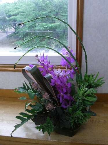 ハラン、トクサ、クッカバラ、入才、ガーベラ、ラン、ミニパイナップル生徒作品