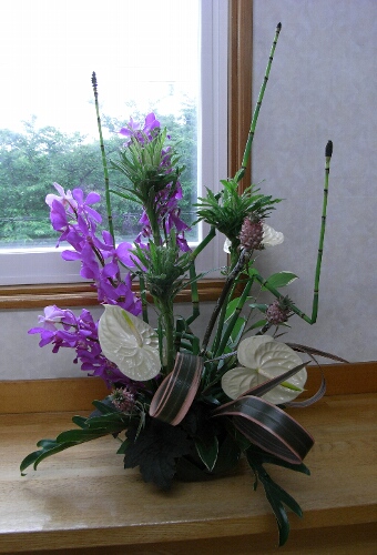 トクサ、入才、クッカバラ、ガーベラ、ラン、アンスリュウム、ミニパイナップル生徒作品