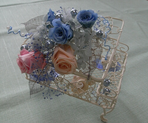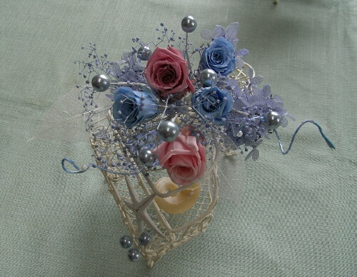ピアノ型の器をプリザーブドフラワー、貝などを飾りました。生徒作品