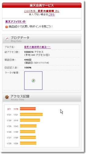 魔術師です。今日は休みです。久々にゆっくりしています。そうこうしている内に 20万アクセス到達です。今回は楽天からも通知がやって来ました。【楽天ブログ】アクセス数のお知らせ================================================================== ■「星影の魔術師の魔法の呪文」が200000アクセスを突破!! http://plaza.rakuten.co.jp/wizardofstarlite/================================================================== あなたのホームページのアクセスカウンターが、 200000アクセスを超えました。 つぎは300000アクセスを超えたときにお知らせします。 今後とも引き続き楽天ブログでお楽しみください。昨日の 1100アクセス目がちょうど 20万アクセスでした。1/31 はアクセスの過去最高記録でした。ひとえに見に来てくれるみなさんのおかげだと感謝しております。ありがとうございます。今後ともよろしくお願いします。何もかも乗り越えて新しい世界なんだって実感しています。fujiwaraさん、早くもコメントありがとうございました。楽天のお買い物マラソンですが何を買おうか、買う物無いからスルーかな。イオンのネットスーパーで山ほど注文したのです。近くのイオンから配達になります。ここで淡麗グリーンを注文しています。楽天最安値よりも安いのでこちらです。3000円以上で送料無料になるしベルギービールを一時飲んでいましたが、安いけど味が薄いので 3-4本飲んでしまう。だったら淡麗グリーンで 2本で済まそうかと考えを改めました。人気記事の一覧のあるトップへ星影の魔術師に応援のクリックをポチッとお願いします。 皆さんの、協力に感謝しています。
