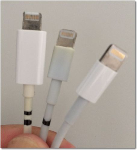 魔術師です。iPhone5S Lightning ケーブル選別iOS 7 になって互換ケーブル切りが発生して、互換性の低い Lightning ケーブルは使え無くなりました。一番右が Apple 純正 Lightning ケーブルです。iPhone5 に付属していました。中は互換性チェックで警告が出るものの充電が出来るケーブルです。マジックで線 1本マーキング左は片面でウンともスンとも反応がありません。裏返して接続すると警告が出るけれど充電は出来ます。コネクタのエッジ部分が金属で覆われていませんね。端子部に黒い色が見えますが、銅の青い錆で、緑青が出ています。これ派遣 1号くんにあげました。彼も iPhone5 au の白だけど、iOS 7 に上げてなかったので。「高いんですよね」って言ってたので予備ケーブルは持って無いみたい。最初反応し無くて、使え無いゴミくれて、「イジメかと思った」何て言われちゃいました。まぁ、魔術師の気持ち的にはゴミなんでその通りだったりするんだけど。iPhone5 が出た初期の互換ケーブルで 1280円か 980円で安いって思って買ったケーブルです。DOCK 変換コネクタこれ一度も使わずして使え無くなりました (T_T)microUSB - Lightning 変換アダプタは、Applpe 純正を買いましたから大丈夫でしょう。iphone5 iPhone5s iPhone5c usbケーブル iOS7iphone5 usbケーブル Lightning USBケーブル iPhone5 ipad mini 最新ipad ipod iPodnano7 iPhone5s iPhone5c対応 iOS7 に対応 メール便可【RCP】02P01Sep13★iOS7対応! Lightning usb ケーブル ライトニングケーブル iPhone5 iphone アイフォン5 iPad mini【iphone5 ケーブル iphone5s iphone5c iphone apple アイフォン ケーブル 充電器 lightning ライトニングケーブル コネクタ コード USB】 Lightning usbケーブル 全2色【1m 0.5m 0.2m 50cm 20cm】どちらも警告も出ずチャンと使えています。人気記事の一覧のあるトップへ星影の魔術師に応援のクリックをポチッとお願いします。 皆さんの、協力に感謝しています。