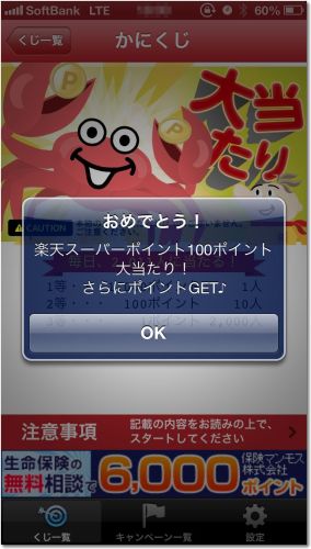 魔術師です。昨日 iPhone のラッキーくじアプリでかにくじ当選でした。その時はいつもの画面でしたが、ポイント明細を見るといつもと違う。メールで確認すると、確かに違っていました。━━━━━━━━━━━━━━━━━━━━━━━━━━━━━━━━━━━━━ ┏━━━┓ ===================================================== ┃楽●天┃ ★★ 楽天ラッキーくじ_かにくじ ★★ ┗━━━┛ =====================================================------------------------------------------------------------------------- ◇◇おめでとうございます◇◇ ~ ご当選のお知らせ ~━━━━━━━━━━━━━━━━━━━━━━━━━━━━━━━━━━━━━** ** 様 (メアド)日頃より楽天ラッキーくじアプリをご利用いただき、誠にありがとうございます。この度は、「楽天ラッキーくじ_かにくじ」にご参加いただき、ありがとうございました。2013年10月16日の楽天ラッキーくじ_かにくじにおきまして、** **様が「楽天スーパーポイント100ポイント」のご当選者に決定いたしました。おめでとうございます!今後とも楽天スーパーポイントギャラリーを、どうぞお楽しみください! ★★お得なキャンペーン実施中!★★━━━━━━━━━━━━━━━━━━━━━━━━━━━━━━━━━━━━━┌┐ ☆★0円無料でポイントがもらえるキャンペーン特集!★☆└■─────────────────────────────────── 【無料】で楽天スーパーポイントがもらえる★お得なキャンペーンが満載! とっても簡単♪下記サイトからキャンペーンを利用するだけ▼▼▼今すぐクリック▼▼▼http://grp08.ias.rakuten.co.jp/redirect/?r=37e65a1386038eeb&c=737cfdf6cc2ca50e━━━━━━━━━━━━━━━━━━━━━━━━━━━━━━━━━━━━━--------------------------------------------------------------------------情報発信元 :楽天株式会社〒140-0002 東京都品川区東品川4-12-3 品川シーサイド楽天タワーお問い合わせ先:ad-B-spginfo@mail.rakuten.com━━━━━━━━━━━━━━━━━━━━━━━━━━━━━━━━━━━━━ビックリでした。いや、いいことあるかな。人気記事の一覧のあるトップへ星影の魔術師に応援のクリックをポチッとお願いします。 皆さんの、協力に感謝しています。