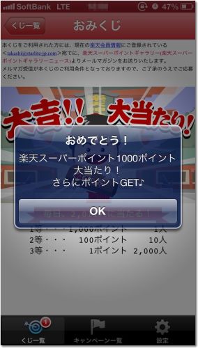 魔術師です。何とビックリです。Subject: 【ラッキーくじ】ご当選のお知らせMime-Version: 1.0X-UIDL: m!;"!;Zi!!/#&"!@^d"!X-EsetId: AF2FFD3EA59AA03FFE6AA1Content-Type: text/plain; charset=utf-8--------━━━━━━━━━━━━━━━━━━━━━━━━━┏━━━┓ ================================┃楽●天┃ ★★ 楽天ラッキーくじ_みこくじ ★★┗━━━┛ ================================------------------------------------------ ◇◇おめでとうございます◇◇ ~ ご当選のお知らせ ~━━━━━━━━━━━━━━━━━━━━━━━━━** ** 様 (メアド)日頃より楽天ラッキーくじアプリをご利用いただき、誠にありがとうございます。この度は、「楽天ラッキーくじ_みこくじ」にご参加いただき、ありがとうございました。2013年12月18日の楽天ラッキーくじ_みこくじにおきまして、** **様が「楽天スーパーポイント1000ポイント」のご当選者に決定いたしました。おめでとうございます!当選したポイントは翌日中に付与されます。獲得したポイントは、楽天スーパーポイントの履歴画面でご確認下さい。今後とも楽天スーパーポイントギャラリーを、どうぞお楽しみください! ★★お得なキャンペーン実施中!★★━━━━━━━━━━━━━━━━━━━━━━━━━┌┐ ☆★無料でポイントがもらえる特集!★☆└■─────────────────────────────────── 【無料】で楽天スーパーポイントがもらえる★お得なキャンペーンが満載! とっても簡単♪下記サイトからキャンペーンを利用するだけ▼▼▼今すぐクリック▼▼▼http://grp08.ias.rakuten.co.jp/redirect/?r=37e65a1386038eeb&c=737cfdf6cc2ca50e━━━━━━━━━━━━━━━━━━━━━━━━━-----------------------------------------情報発信元 :楽天株式会社〒140-0002 東京都品川区東品川4-12-3品川シーサイド楽天タワーお問い合わせ先:ad-B-spginfo@mail.rakuten.com━━━━━━━━━━━━━━━━━━━━━━━━━こんなこともあるのですね、OCN の星座占いが1位だったからかな?おおー、ありがたや人気記事の一覧のあるトップへ星影の魔術師に応援のクリックをポチッとお願いします。 皆さんの、協力に感謝しています。