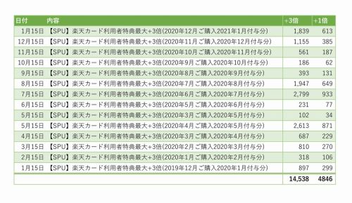 魔術師です。楽天ゴールドカードの SPU ポイントアップ条件の改悪のアナウンスで一体いくらポイントを獲得していたのか集計することにしました。楽天 PointClub の履歴を見て 1年分のポイント獲得履歴を集計しましたゴールドカードであることで得られたポイントの集計です。通常のカード購入での獲得ポイントは別にあります。これを見ると+3倍がゴールド、+1倍がノーマル楽天カードでのポイントとなりますが条件改悪後はノーマル楽天カードと倍率が同じになるので年会費分だけ損になります。この獲得ポイントならプレミアムカードの年会費はまかなえるのでプレミアムカードに出来るなと言うことでとりあえずプレミアムカードに申し込んで審査があるので通ればプレミアムカード通らなければノーマルカードにグレードダウンしましょうか。どちらにしてもカードを登録している先を変えないといけません。電気とか電話とかがあるので面倒くさいのですよね。コストコでロティサリーチキンを買ってきていて裁いたあとの鶏ガラを使って圧力鍋で煮込んで鶏ガラスープを作ってくれました。これが焼鳥屋の食事の〆に出てくる鶏ガラスープの味でした、濃厚鶏ガラ出汁で鶏ガラの出汁がよく出て美味しいですね。焼鳥屋のスープはガラスープだけで具は入ってないのですが、わが家の鶏ガラスープは野菜が沢山入ってます。おまけに溶き卵まで。昨日の晩に出たのですが沢山作ってるので今朝も飲みました。熱いスープで暖まります。今日は休みです。リモートだと面倒くさいことも多いのですが今日は解放されます。ゆっくりしましょう。人気記事の一覧のあるトップへ楽天のサービス紹介ページへ飛ぶ星影の魔術師に応援のクリックをポチッとお願いします。 皆さんの、協力に感謝しています。