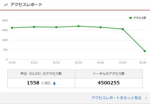魔術師です。気が付くと 450万アクセスを越えました。早速記録に留めないといけません。これも日々アクセスしに来てくれる皆さんのおかげだと思っています。本当にありがとうございます。スクショです。例によってスクショは自分の記録のためです。最近はめっきりアクセス数が落ちています。既に閉じてしまった前のブログで記録に残っているアクセス数が 188181アクセスでそれを加えた数字が今までのブログを始めてからの総アクセス数になります。始めたころは、3万アクセスくらいに行くと格好が付くのにと思っていました。最初は日に 50アクセスが目標でした、そして目標が 100アクセスになり、200が目標になった時にはなかなか 200アクセスにならなくって、アクセスが伸びないことに悩みました、長かったです。転機だったのは iPhone5 を買った時で予約したり、買った記事ですかね。大きく伸びました。このタイミングは iPhone の接続コネクタが Lightning に移行したタイミングで Lightning 互換ケーブルの記事もよく読んでもらえました。iPhone を持っている人の 1% いや 0.1% でも見てくれるだけでもスゴいのにと思いましたね。この時に人が知りたいことを載せればアクセスが伸びるのだと実感出来たのでした。そしてネットから色々と教えてもらって勉強になっているので少しでも恩返しが出来るような情報を出せればと思っています。特に自分が苦労したことは他の人も苦労しているのだろうと思っていますからトラブルに関しては解決法も含めて報告していこうと思っています。iPhone5 は 4G/LTE に初めて対応し 3G から 4G に世代が変わった機種でした。折しも今まさに 5G が始まっているタイミングで iPhone13 シリーズが発売されています。何はともあれ拙なブログではありますが見に来ていただいている皆さんのおかげです、改めてありがとうございます。これからも何か面白そうなネタを探していこうと思います。と言っても魔術師の興味のあることだけですけどねw次の大台は 500万アクセスですが、まだかなり先になりますので 10万アクセス単位で刻みます。これからも引き続きよろしくお願いします。人気記事の一覧のあるトップへ楽天のサービス紹介ページへ飛ぶ星影の魔術師に応援のクリックをポチッとお願いします。 皆さんの、協力に感謝しています。