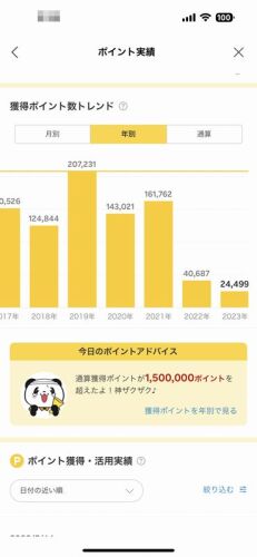 魔術師です。楽天経済圏の住人である魔術師です。世の中には年 100万ポイントを獲得する人もいるようなのですがささやかながら魔術師の近年のポイント獲得の推移を公開します。年別の推移累計ポイント数3年前くらいから楽天のポイント付与の条件改悪が進んでいます。楽天モバイルがサービスインしたタイミングからですね。そのまま単純に獲得ポイントが減ってしまった訳でなくもっとお得なところで買い物をするようになってしまいポイントが分散しています。特に Yahoo!ショッピングの何もしなくてもポイント 10倍なので大きなものはそちらにしてます。けど PayPay ポイントなので貯め込まずにそのまま PayPay 決済で使ってしまうのでポイントが付いた実感が余りありません。また明日にでもすぐ必要なものとかはアマゾンにしています。楽天だとどうしても 2-3日後の発送を覚悟しないといけません。そうなるとポイント関係なしです。かなりがんばった結果でこれですが年 100万ってどうなんだって思います。前は何もしなくても 8-9倍くらいになってたので積極的に買っていたけど今は 4-5倍なので楽天では余り買ってないですね。楽天ビューティとか楽天パシャとかはやっていませんもう少し底上げ出来るのかな?三井住友カードの修行中で楽天カードも使ってないし昨日は鶏のタタキとスパゲッティナポリタンを作ってくれました。鶏のタタキはむね肉ともも肉の食べ比べでした。タレが美味しくてツルッと食べてしまいました。ナポリタンはコストコで手に入れた吊るしベーコンで濃厚なケチャップを買ってきてくれて作ってくれました。麺類は好きなので美味しかったので山盛り食べてしまいました。今日から今週が始まります。G7 連休が木曜日からなので今週は 3日ほどがんばりましょう人気記事の一覧のあるトップへ楽天のサービス紹介ページへ飛ぶ星影の魔術師に応援のクリックをポチッとお願いします。 皆さんの、協力に感謝しています。