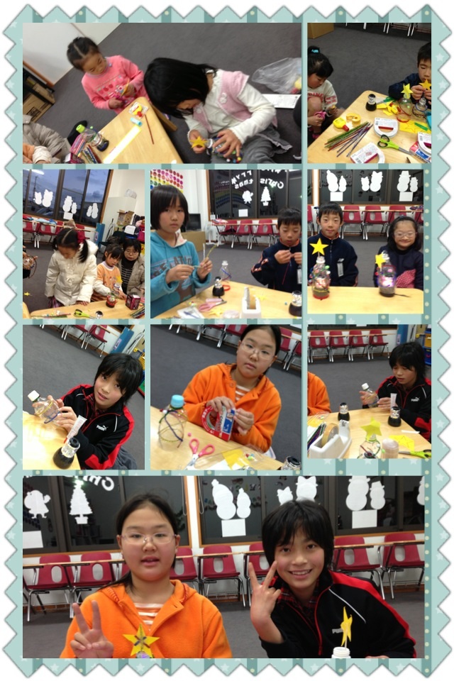 こんばんは昨日と今日の私のクラスのクリスマスレッスンの写真をアップしますまずは吉原金曜日いつもは木曜日のバニーですが金曜日にクリスマスレッスンをしましたママと一緒にサンタさんの顔を書いて小麦粉人形を作っていたら…サンタさんが来て、プレゼントまでもらっちゃいましたレッスン後もサンタさんを探していました続いて年中・年長さんクラスいつもはママに手伝ってもらっていましたが、昨日は自分たちでぜぇ~んぶ作りましたボンドが手についちゃって大変だったけど頑張りましたキレイにできたね1年生クラス1年生でもすごくこだわって作っていました自分でビーズやリボンを持ってきてとても上手にデコレーションしていました3~5年生クラスモールをツイストしたり、フェルトを切ったりと自分たちである材料をアレンジして作っていました4・5年生クラス前クラスと同様、工夫しながらこだわって作っていましたライトをつけて外にいったらとてもキレイでしたそして本日の長泉土曜日クラス1・2年生の女の子クラスでは、可愛らしいツリーランプができました4・5年生のクラスでは、キレイvs芸術女の子は細部までこだわり、男の子は思うがままにアート作品を作っていました私にはできない発想ですとってもキレイなツリーランプができましたぜひ、お家に飾ってね土曜日クラスは本日で2012年のレッスンは最後です次回は1月冬休み話、楽しみに待ってま~す金曜日クラスはもう1回ありますお家でのクリスマスのお話聞かせてね*吉原・長泉 Shiho*
