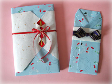 向かって右側の、浴衣に見立てた袋の中には、商品券や図書券等が入ります。左側は箱を包んだ後、掛け紙と熨斗をアレンジ。