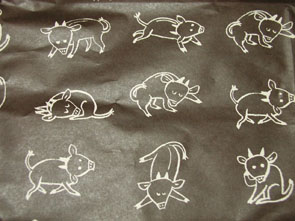 その牛タンを、包んであった包装紙の柄の牛の絵、なんとも言えないんです。なんだか、ほのぼの、癒し系。のんびり、まったり、くつろいでいる姿の牛さん。豚にもいのししにも見えてしまいます。おじゃるまるにでてくる“ウシ”にも似ている…。せっかくだから、お店の名前と、包んだ際のシワのない部分を使い、小さな袋を作ってみました。6/17/2写真を差し上げる時にでも使いましょう!!