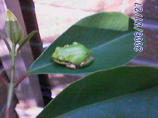今朝はベランダのグァバの葉に珍客。どうやって2階まで来たんだろう?「こらっ!まてっ!ぴょんこ!」・・・いつのまにか「ぴょんこ」