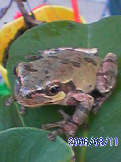 久々にカエルのお客さん(*^_^*)いくら近づいても逃げないから、調子に乗って接写(^_^)v思わず「キャー(>_