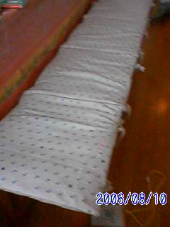 ベンチタイプ(背もたれナシ)の長い椅子においていたクッション(座布団?)のカバーを作りました!椅子の上に置いておくだけじゃ、すぐに子どもが落としてしまって、私が怒りながら拾う落とす怒りながら拾う落とす・・・をずーーーっと繰り返していたのです。で、クッションを4つ並べて入る大きさのカバーを、以前作ったのですが・・・これが失敗で(>_