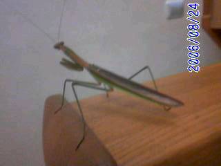 今日の珍客はコイツ。なぜか、家の中にいたんだよね~。どこから入ったの?足とか、体のふちは緑色なんだけど、体の真ん中は茶色いの。緑から茶色に変化してる途中??これ、とっても大きいカマキリだったんだ~。10センチはあったよで、茶色に変化といえば、ベランダにいた緑色のガチャピンが茶色に変色!このあとどうなるの~?