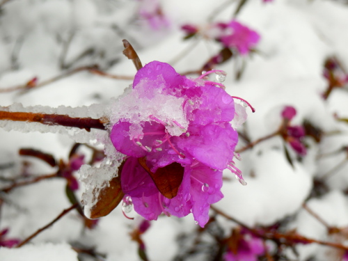 所用で帯広の実家へ。6日am5時頃から降り始めた。撮影は8時頃。5月の積雪は40数年振りとニュース。思い出した、上京して数年、帰郷の途中で登別温泉へ。雪に降られた。肩をすぼめ顏はこわばり、いかにも寒そうな表情で傘をさして写っている写真が一枚残っている。この期間中の低温は100年振りとかTVニュース。そうか、100年に一度有るか無いかの体験をした。これは貴重な体験だ。でもでも、やっぱり温かい方が良い(笑)。函館で、昨日6日ソメイヨシノの開花宣言が有った。札幌ももう直ぐだ。付記:写真クリックで拡大。より雰囲気が増大。